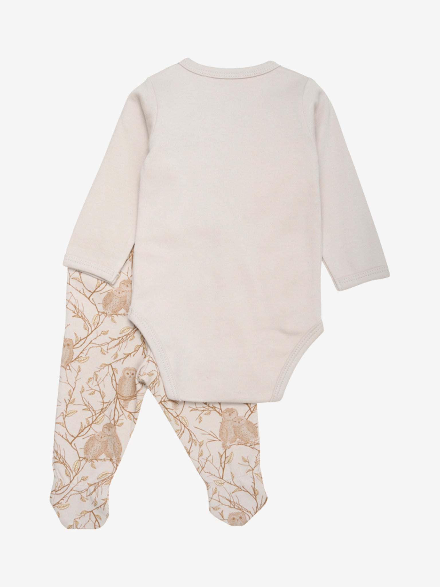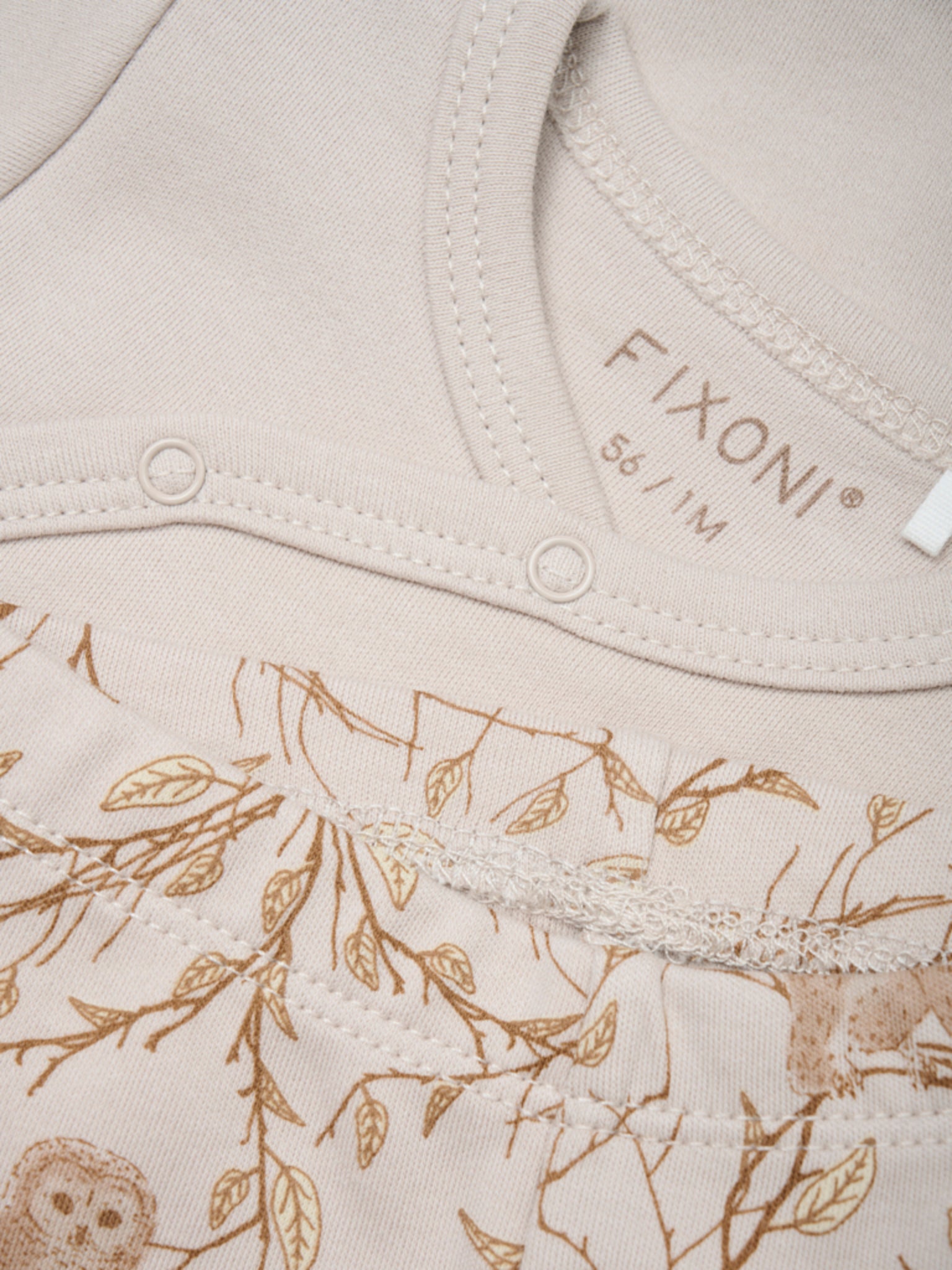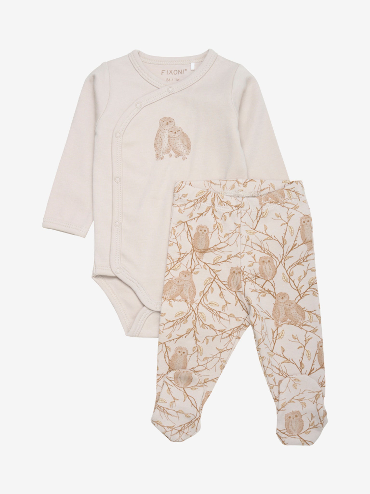 Söt set från FIXONI, bestående av en body och byxor med fötter. Bodyn är med omlottknäppning med långa ärmar, som öppnas med praktiska tryckknappar fram och mellan benen, så den är lätt att ta av och på.