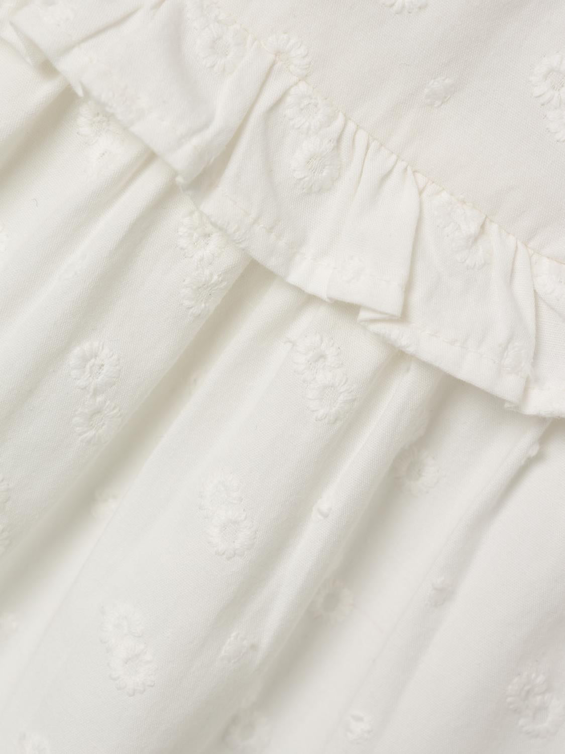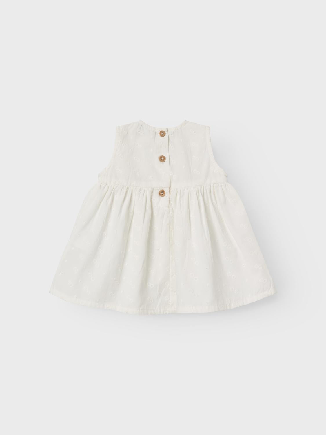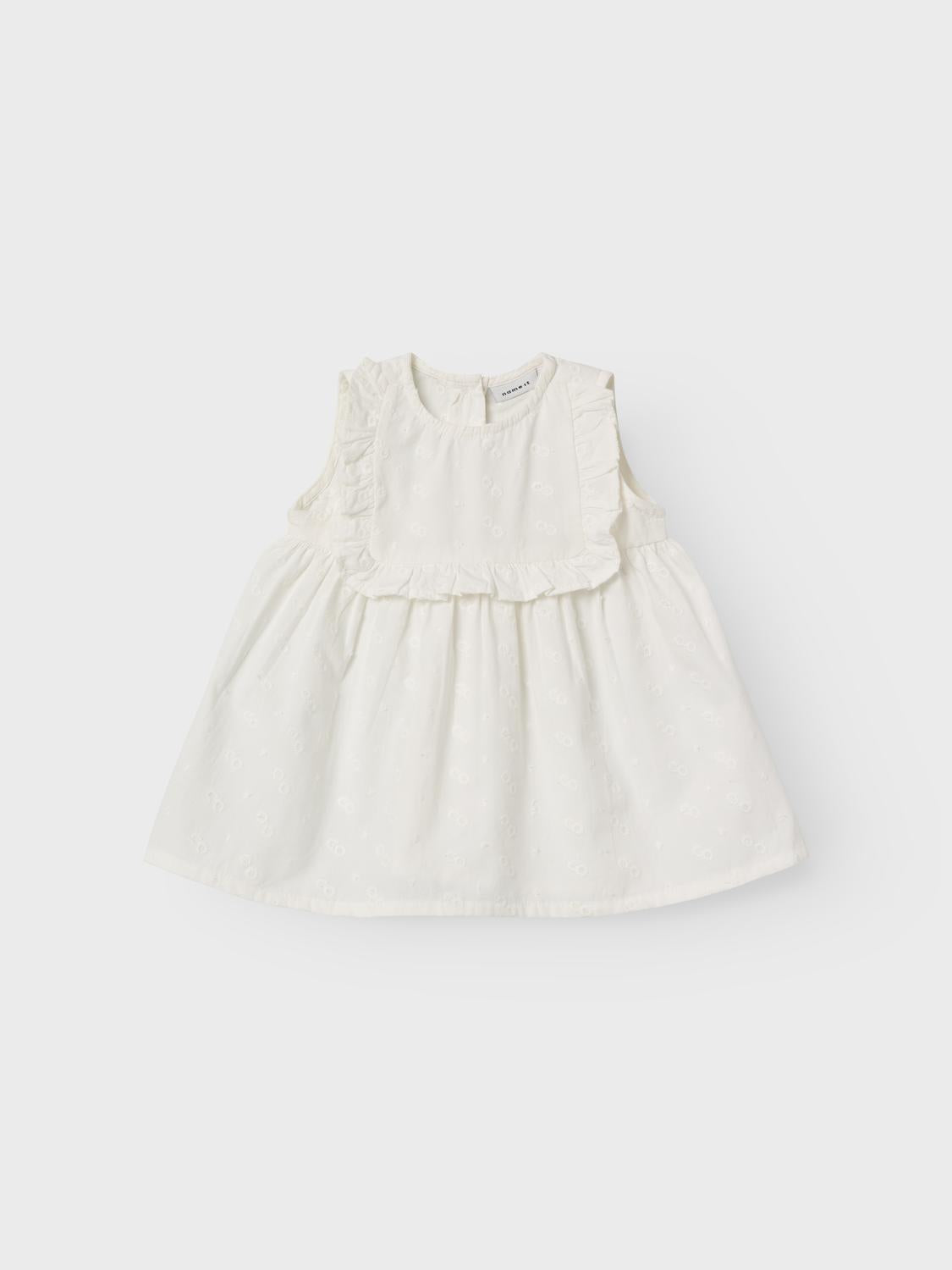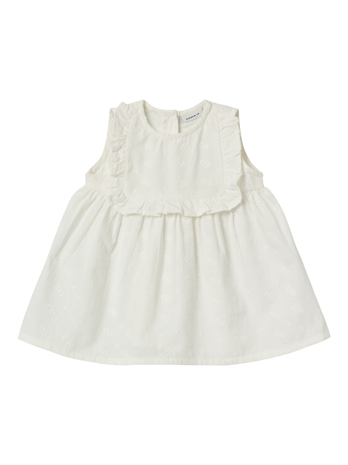 Söt enfärgad klänning till baby. Vävt tyg har ett distinkt korsmönster och en lätt strukturerad yta för en ren och klassisk look.