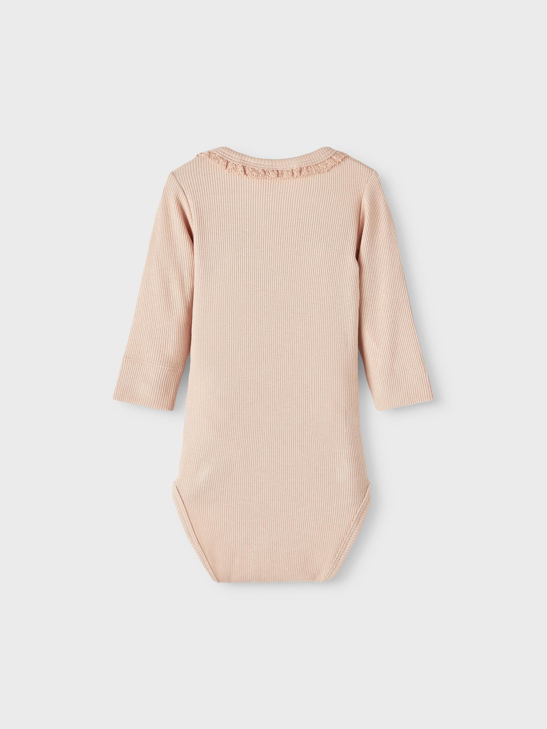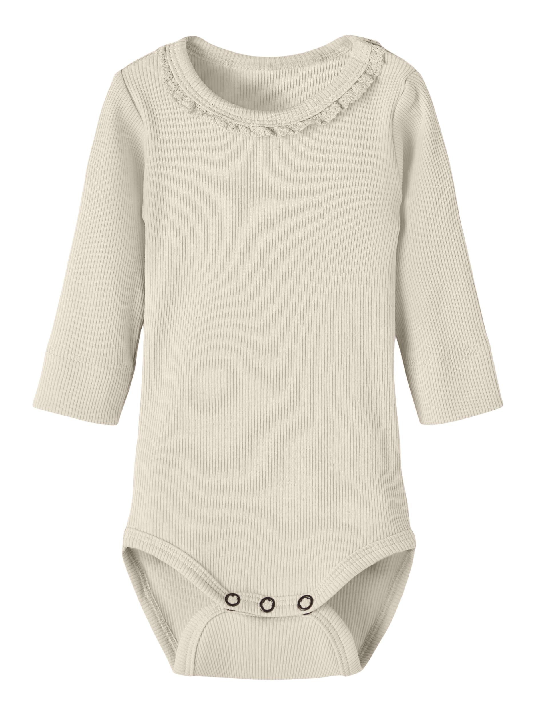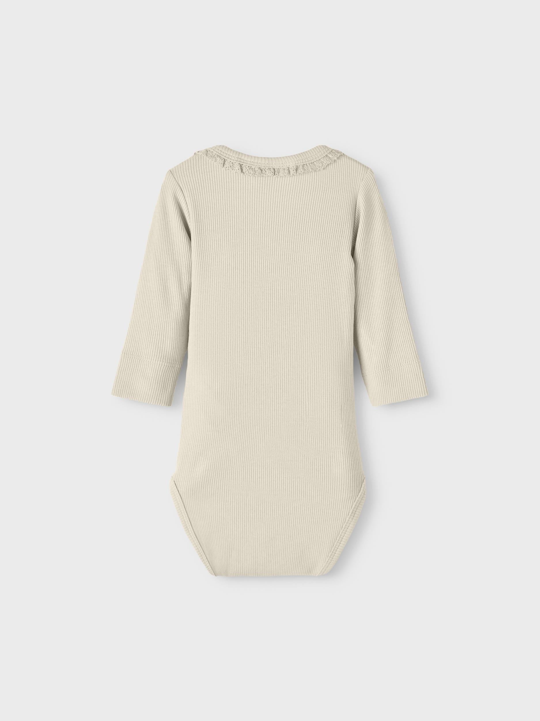 Produkttyp: Bodysuit Tyg: Jersey är ett lätt och stretchigt tyg med en mjuk yta och insida för en bekväm känsla och rörelsefrihet Stängning: Tryckknapp Extra detaljer: Spetsdetalj Hals: O-hals Ärmlängd: Långa ärmar