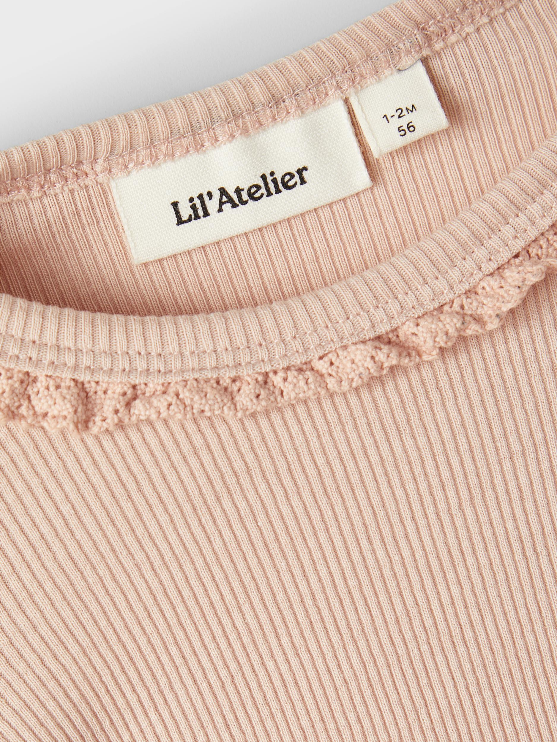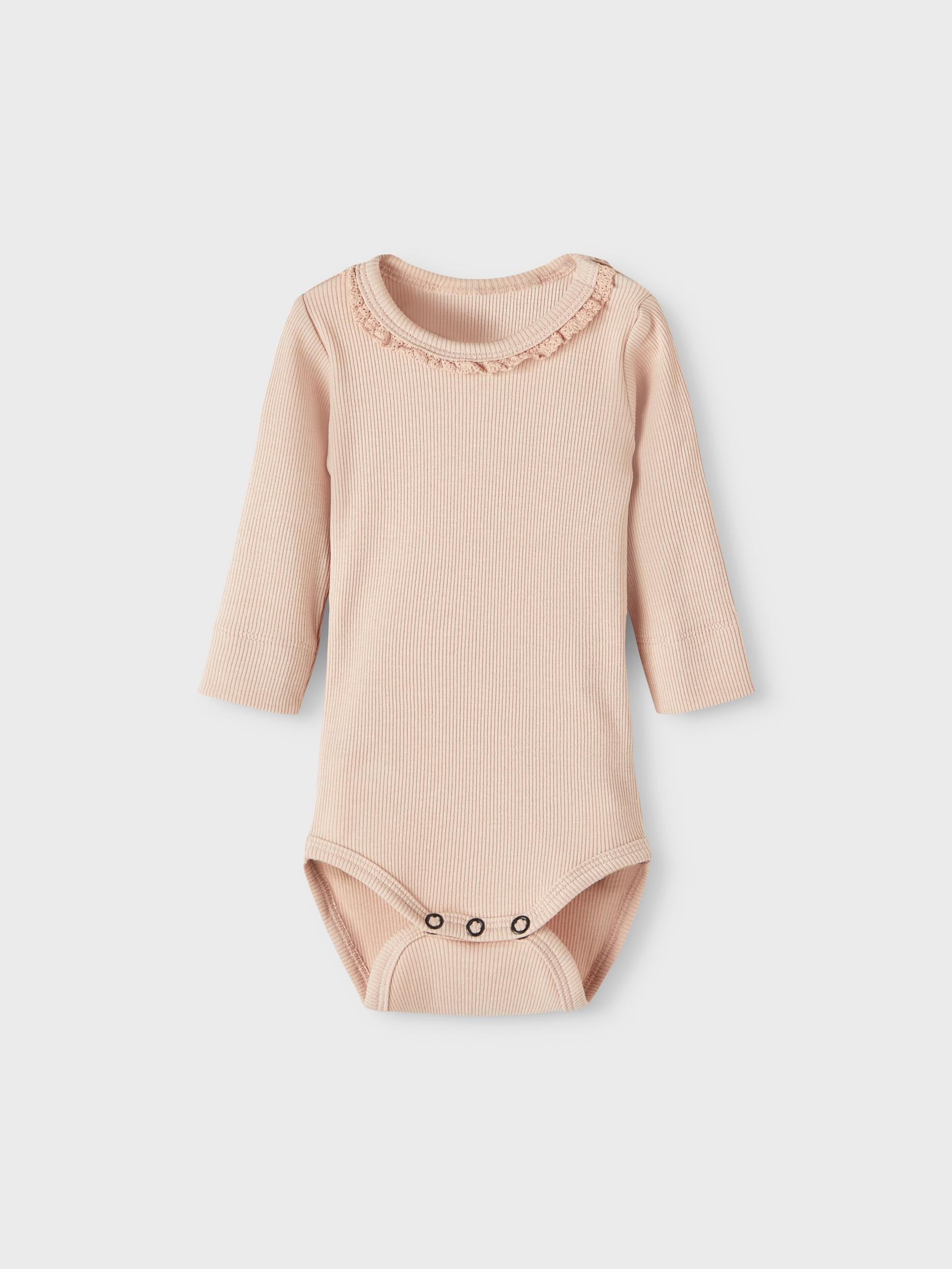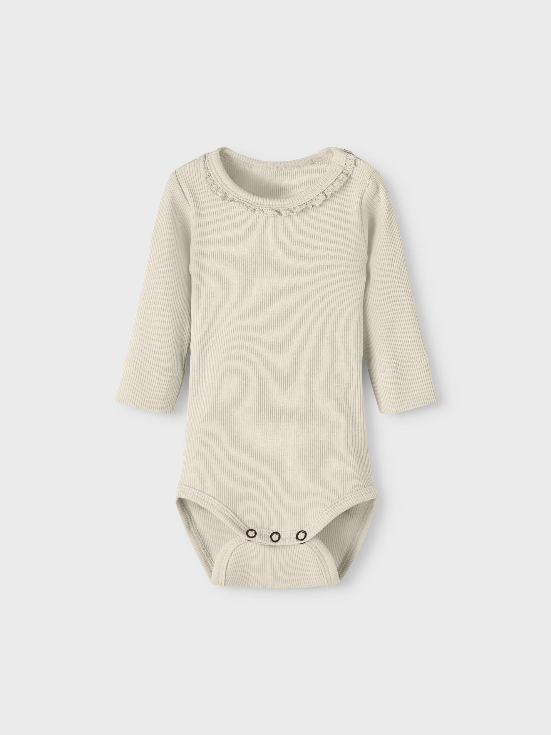 Produkttyp: Bodysuit Tyg: Jersey är ett lätt och stretchigt tyg med en mjuk yta och insida för en bekväm känsla och rörelsefrihet Stängning: Tryckknapp Extra detaljer: Spetsdetalj Hals: O-hals Ärmlängd: Långa ärmar