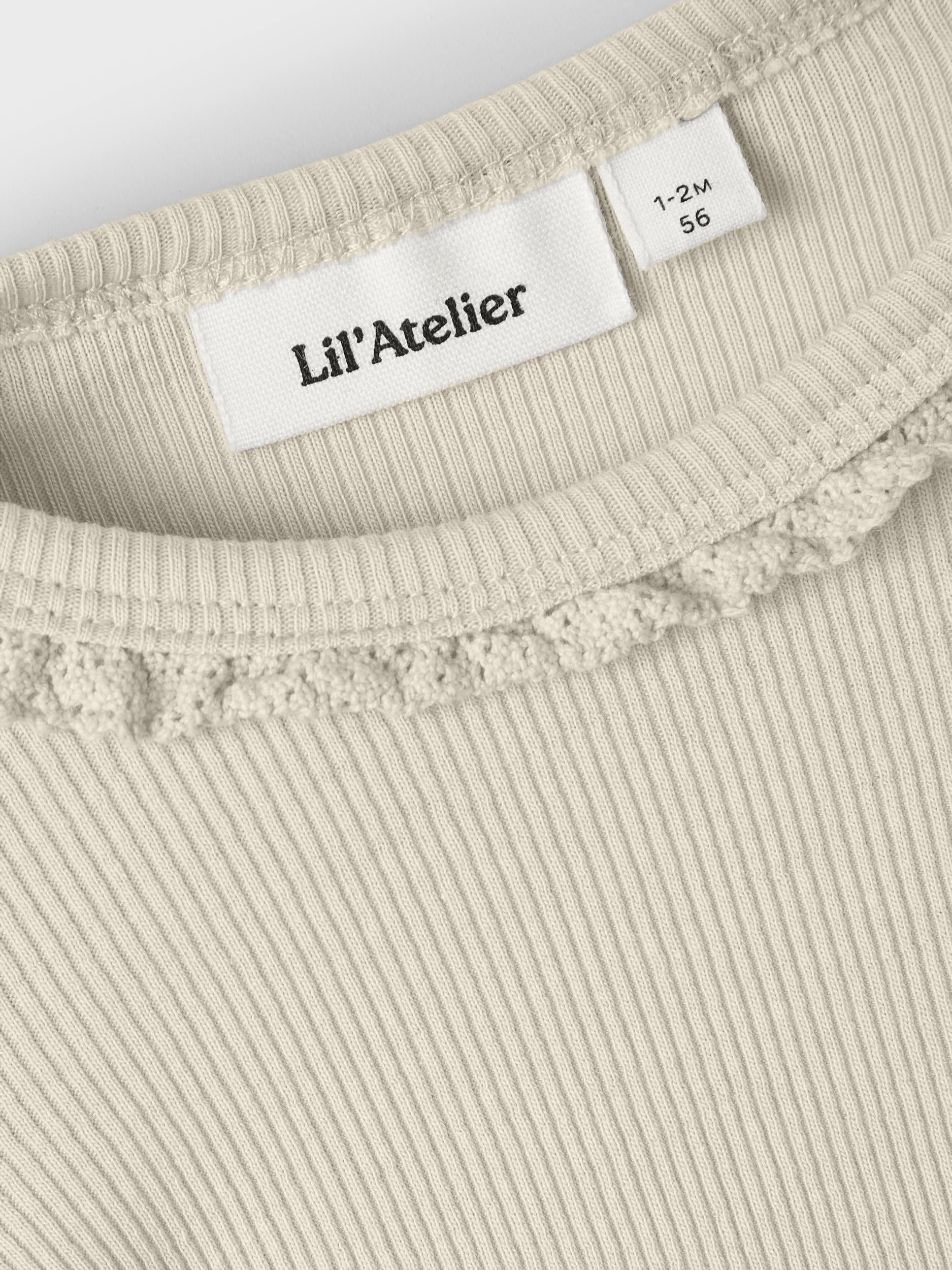 Ribbad, enfärgad body med söt spetskant vid halsringningen. Självklart ekologisk bomull.
