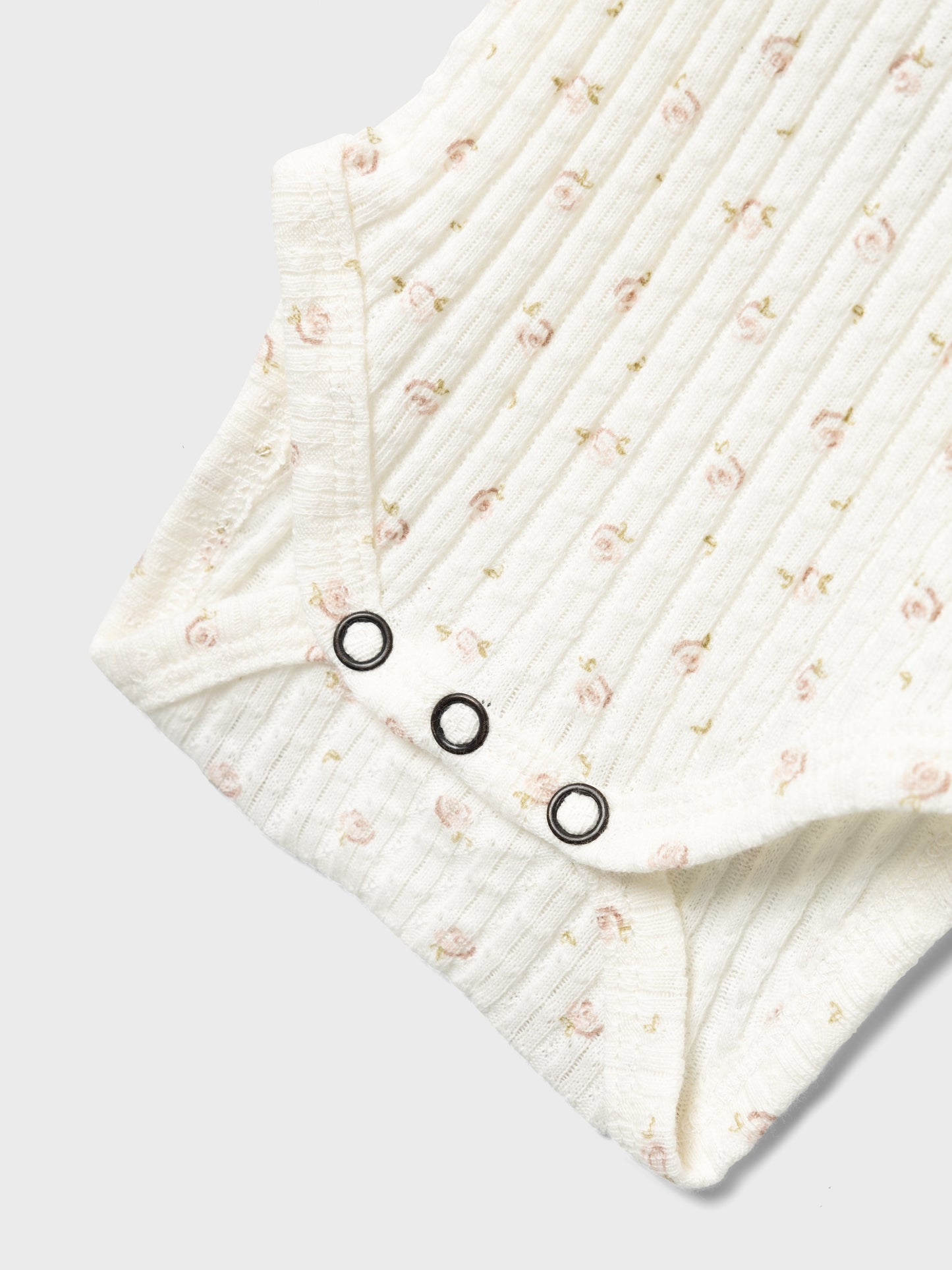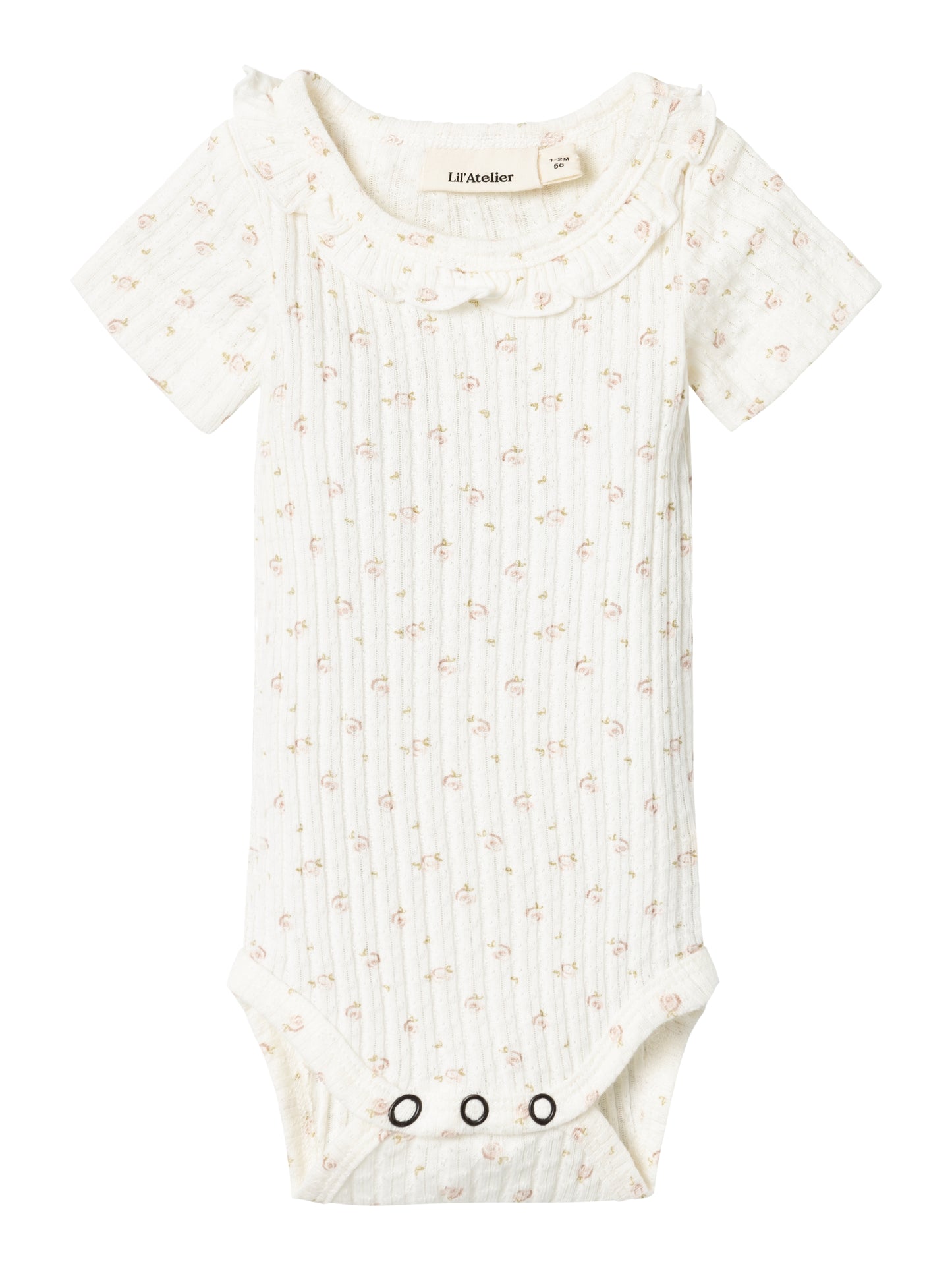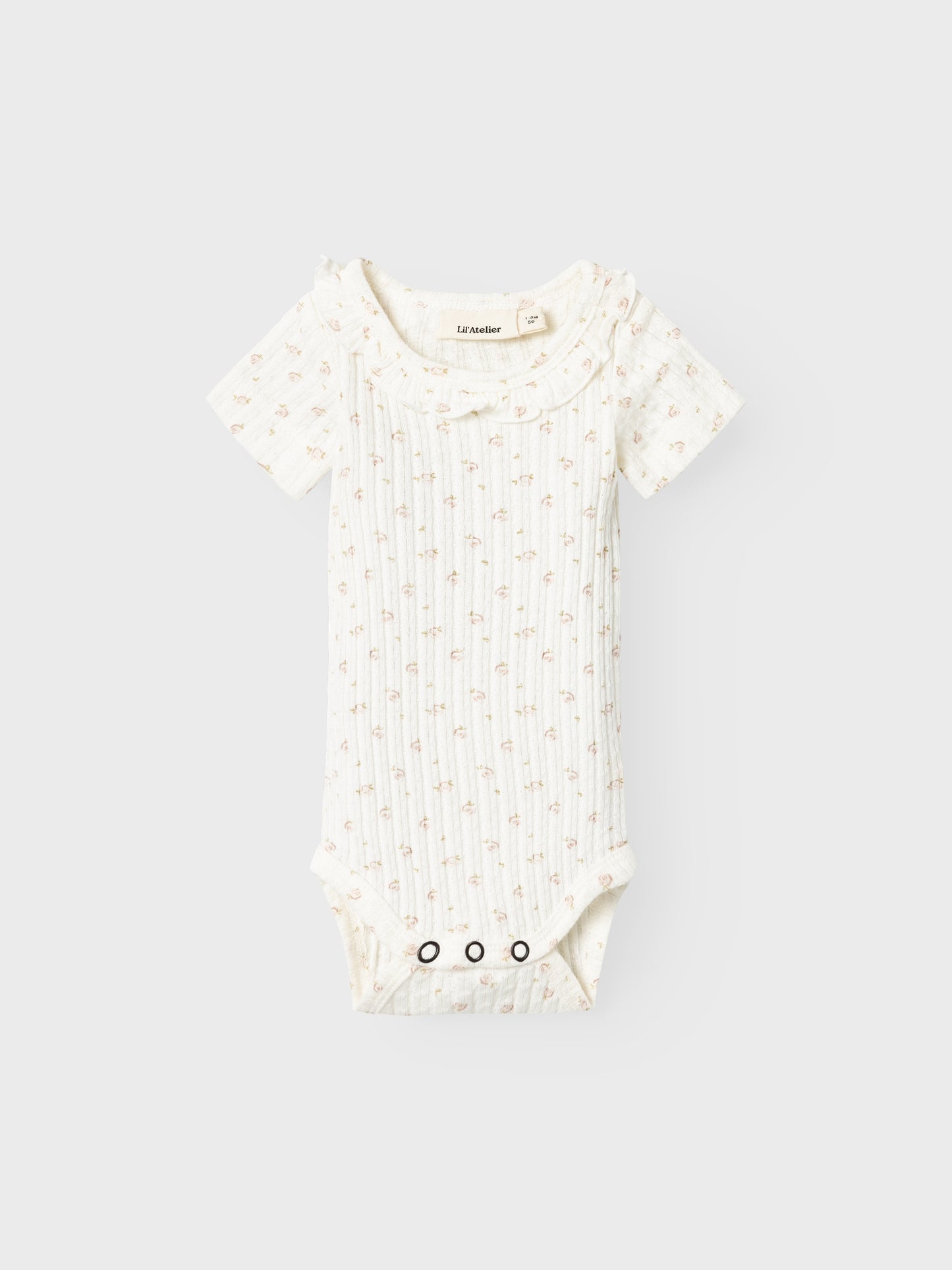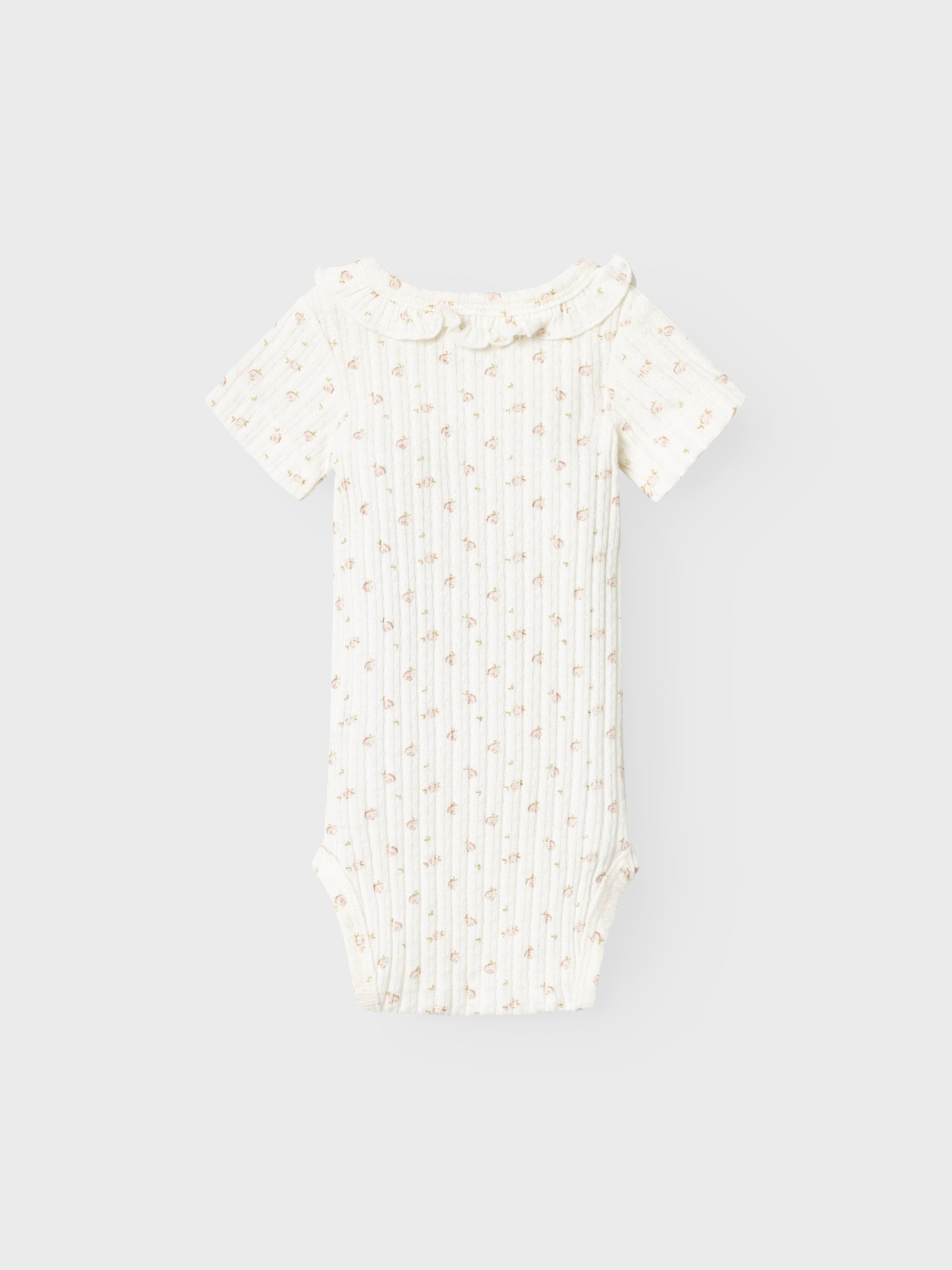 Produkttyp: Bodysuit Hals: Rund hals Ärm: Kort ärm Stängning: Tryckknapp Extra detaljer: Volanger Utskrift: Utskrift upprepas över hela ytan av produkten