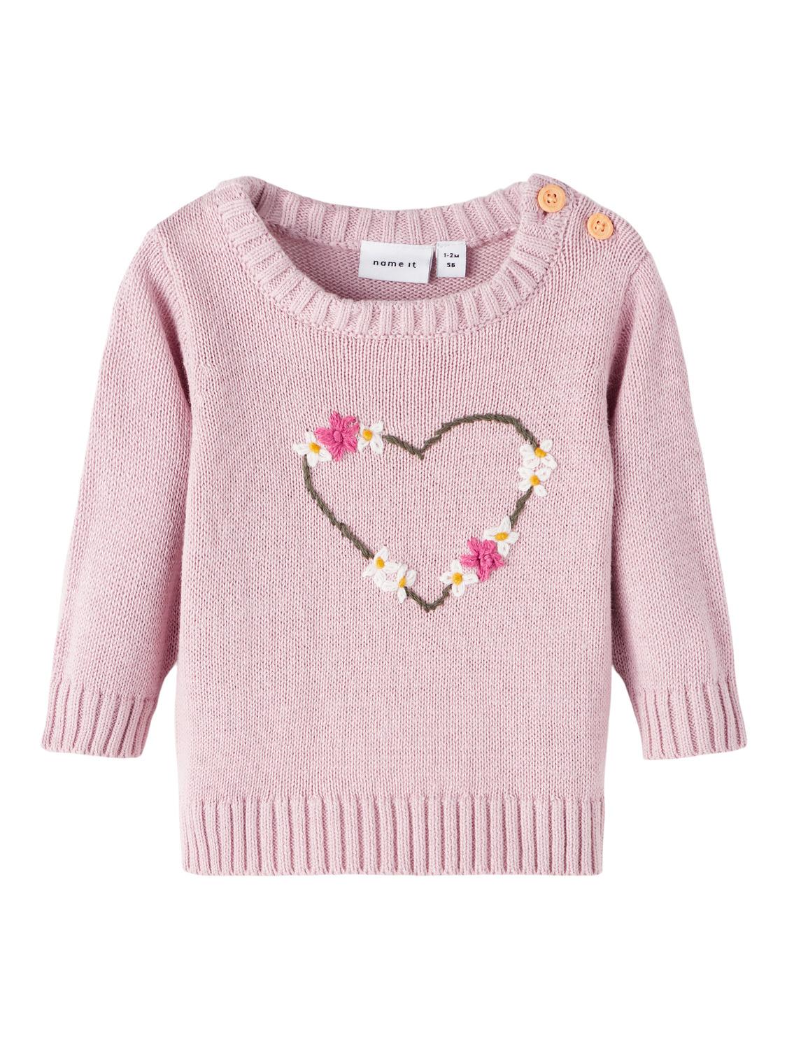 Gullig rosa tröja med broderat hjärta på bröstet. Denna stickade baby-tröja är i 100% ekologisk bomull och är både ljuvligt söt och riktigt cool beroende på vad du kombinerar den med.