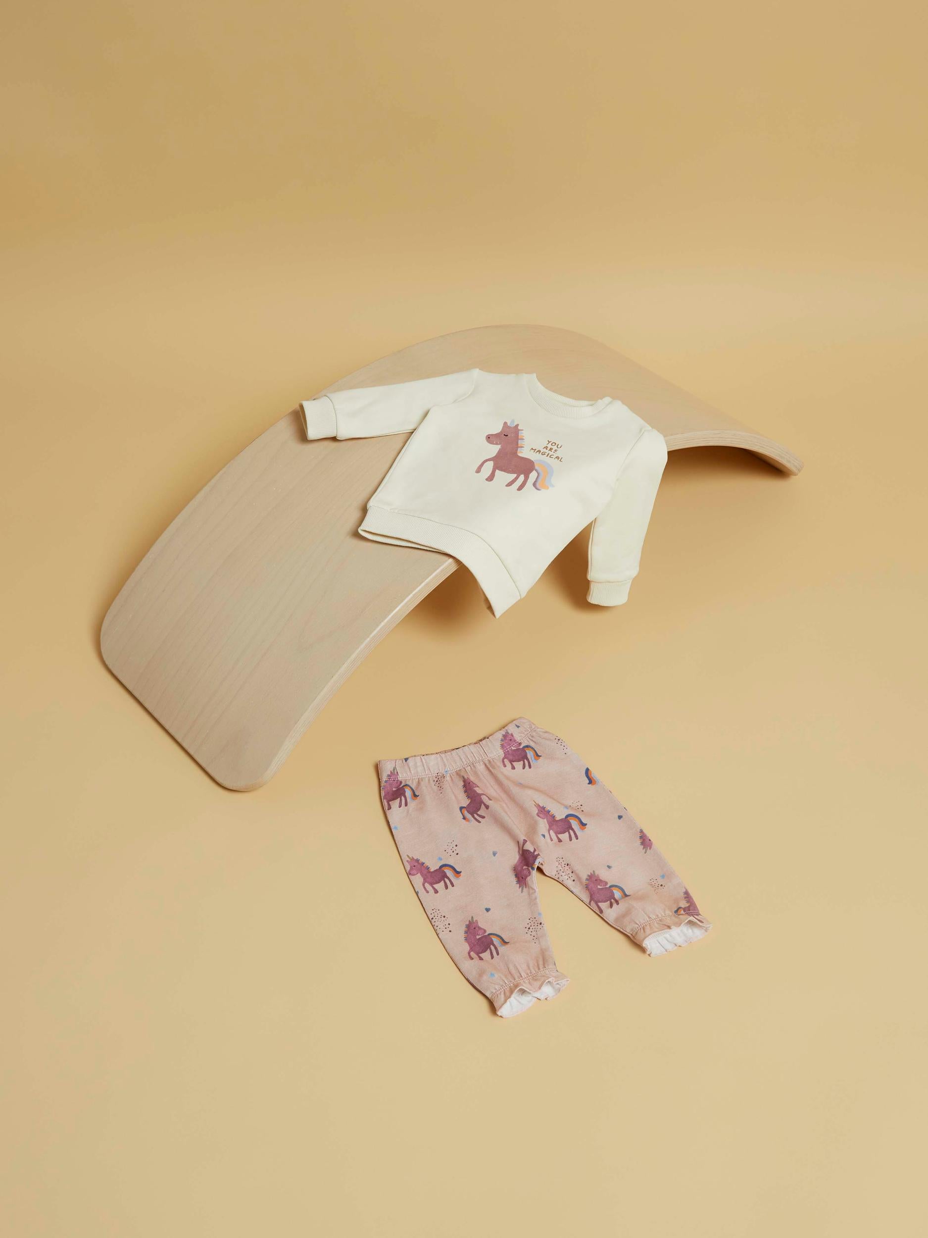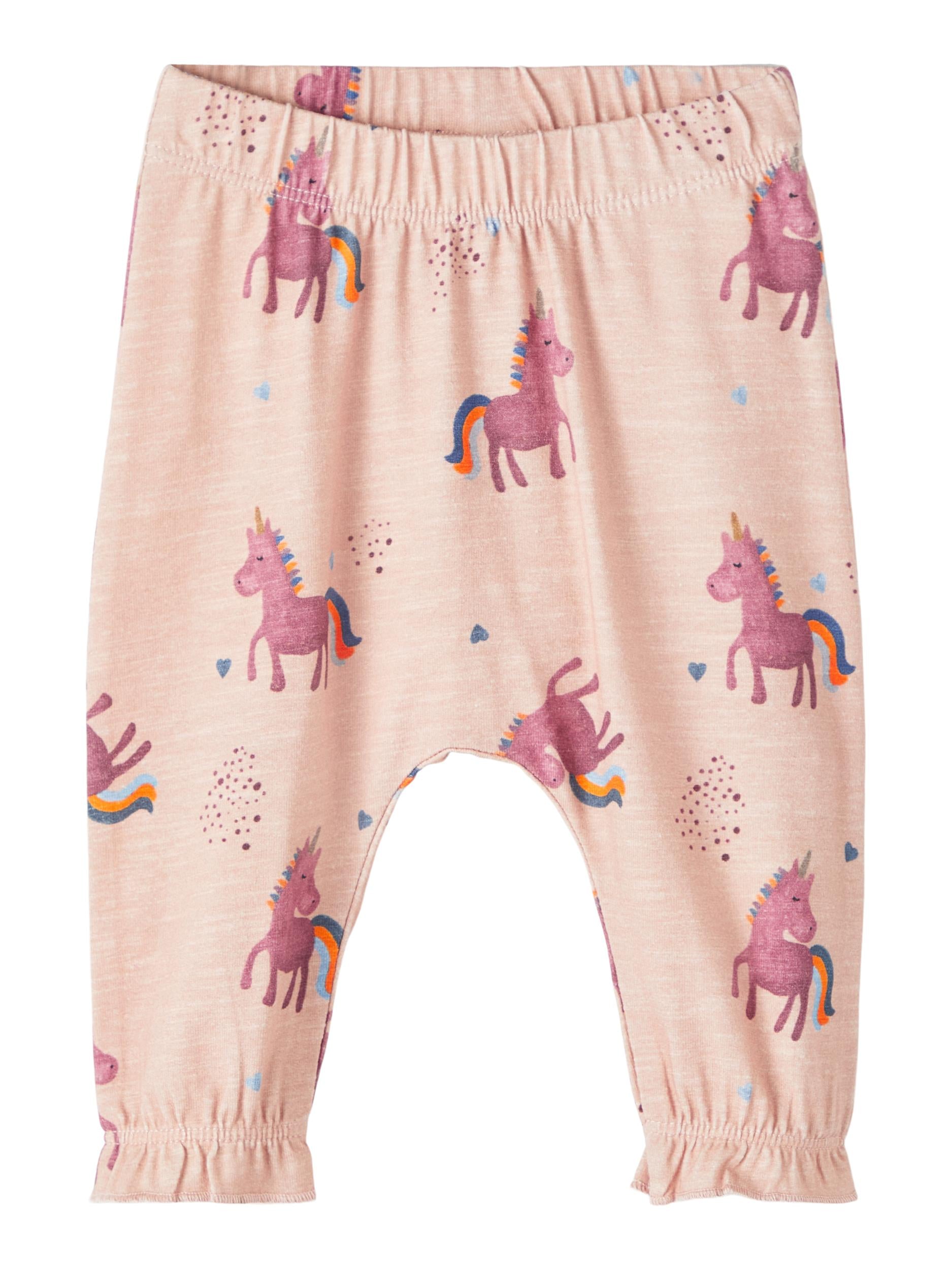 Söt babybyxa med enhörningar överallt. Mjuk, härlig passform som gör att den lilla kan röra sig fritt. Jersey är ett lätt och stretchigt tyg med en mjuk yta och insida för en bekväm känsla och frihet att röra sig.