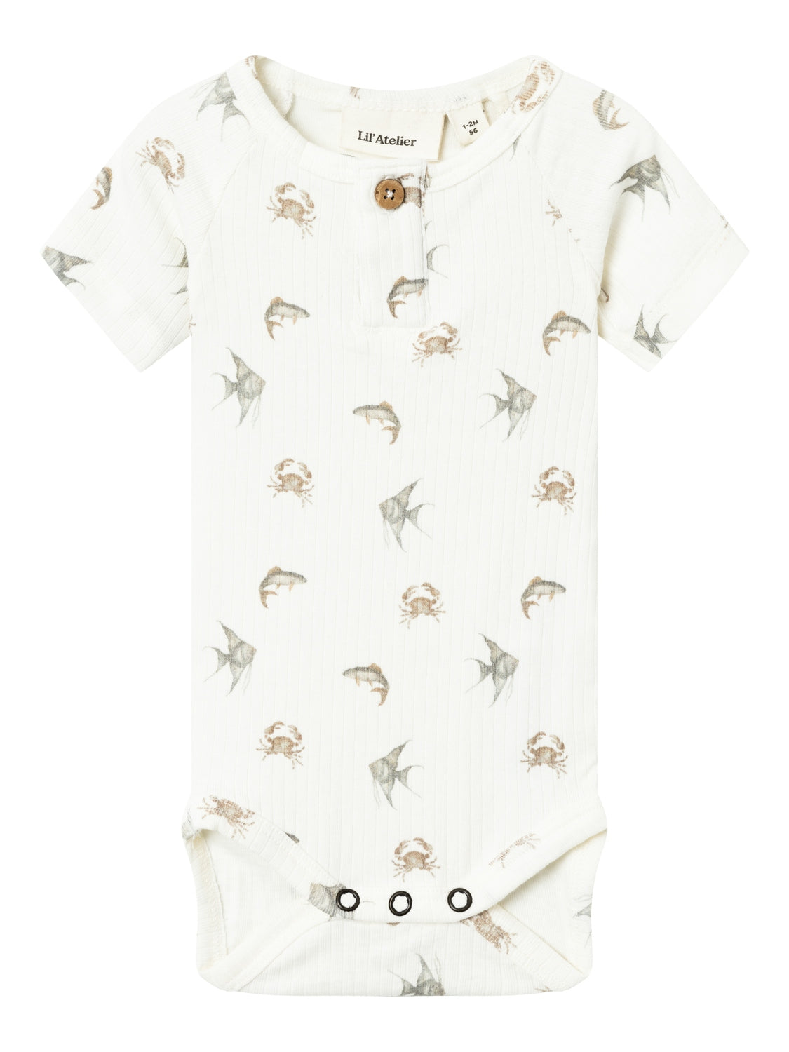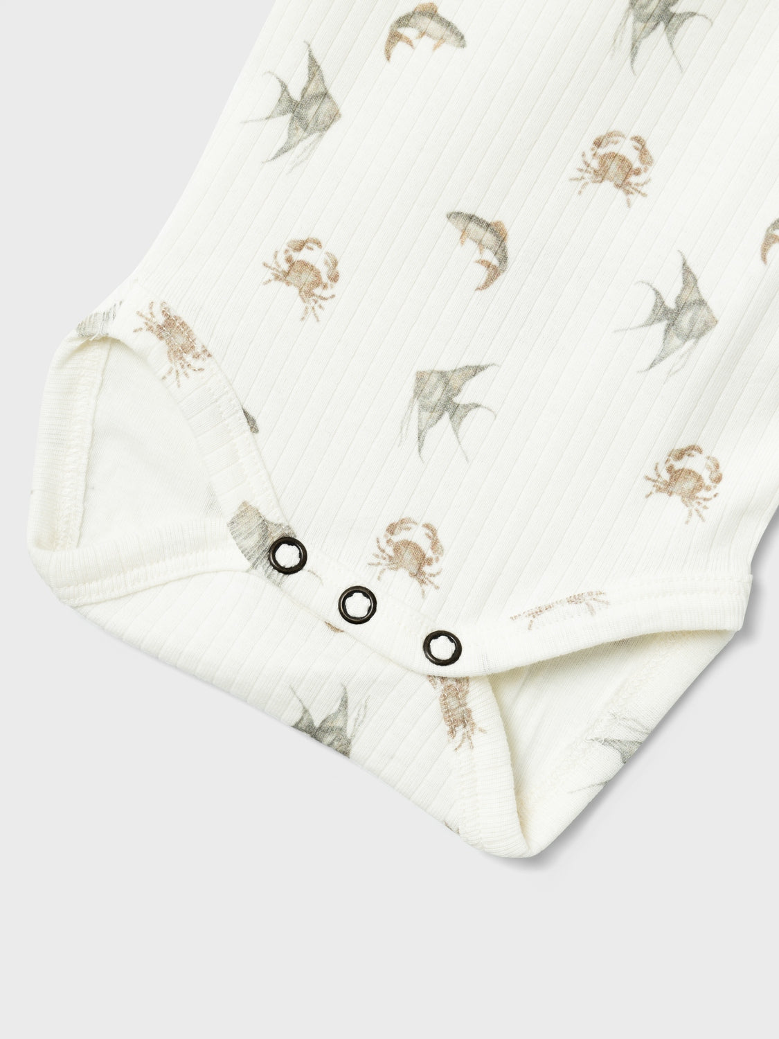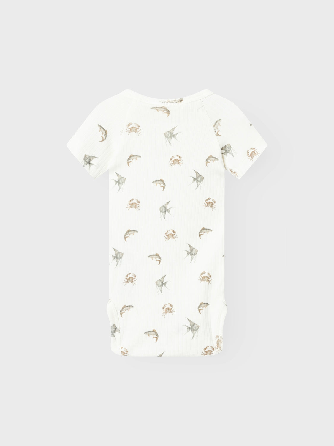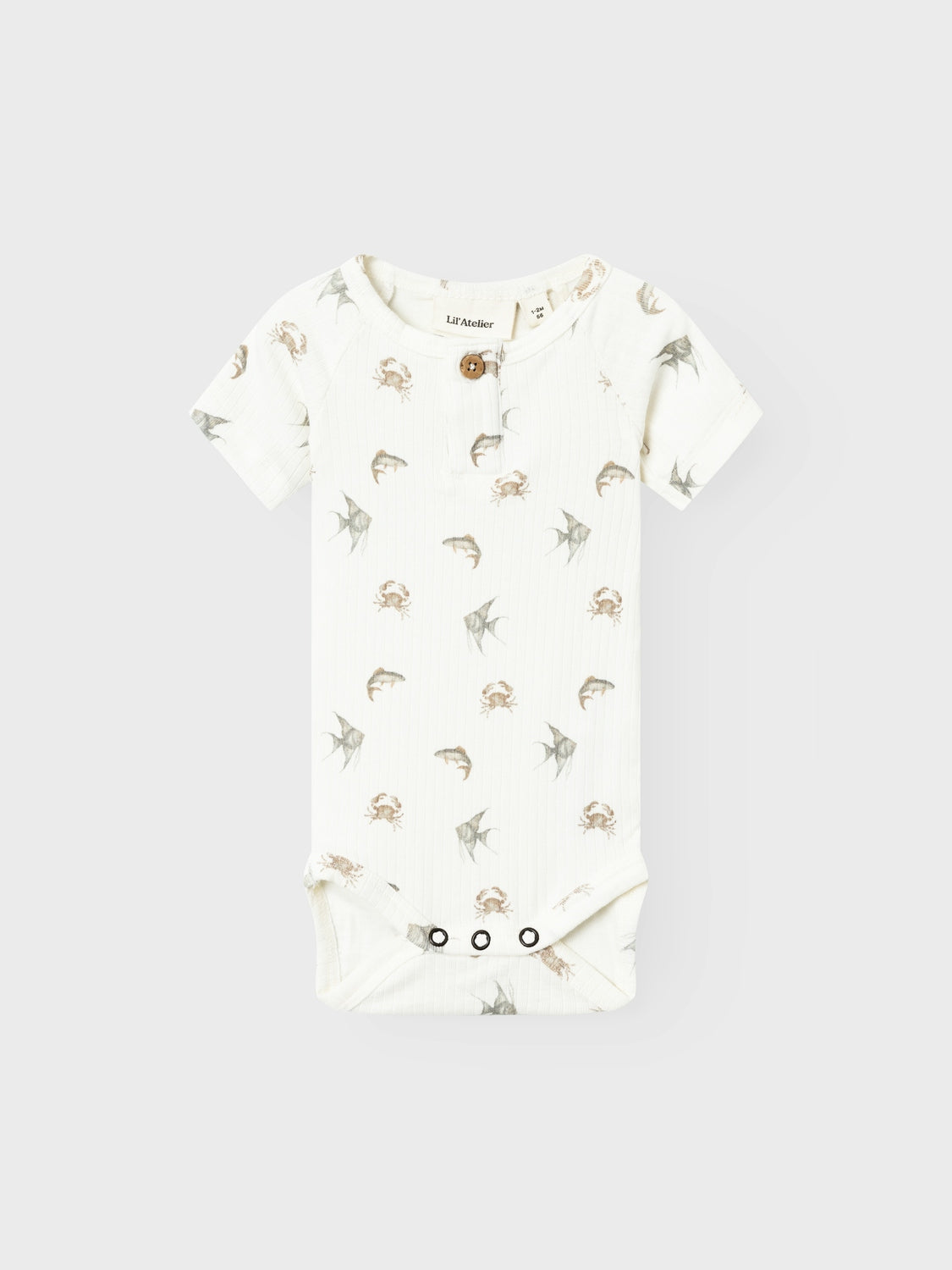 Produkttyp: Bodysuit Hals: Knappar i halsringning Ärm: Kort ärm Stängning: Knäppning med knapp, tryckknapp Print: Mönster upprepas över hela ytan av produkten