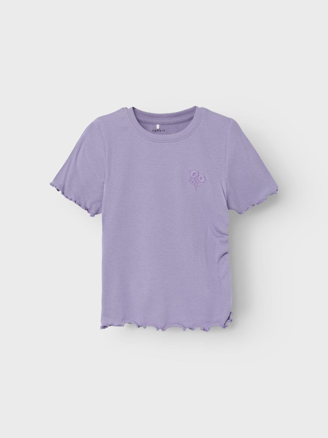 Produkttyp: T-shirt Hals: Rund hals Ärm: Kort ärm Längd/Storlek: Kort Extra detaljer: Ruching detalj, Broderi Passform: Slim Fit