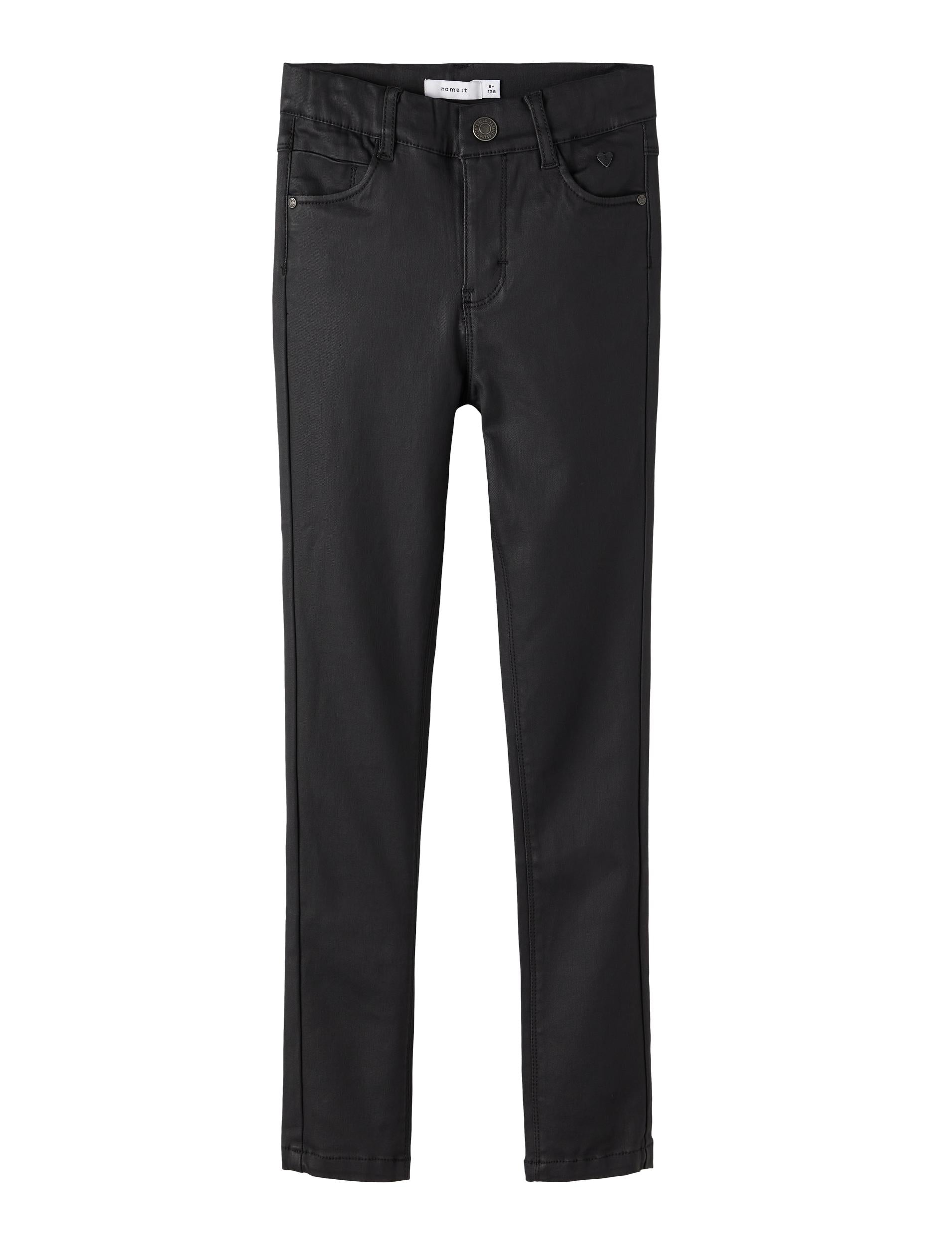 Produkttyp : Skinny fit jeans Stängning: Krokknapp och blixtlås Fickor : Fram- och bakfickor Midja : Hög midja Extra detaljer: Justerbar midja, märke, nitar Tvätt / finish: Belagd effekt för en rolig och glänsande look Passform : Polly är ett par jeans med en heltäckande mager passform