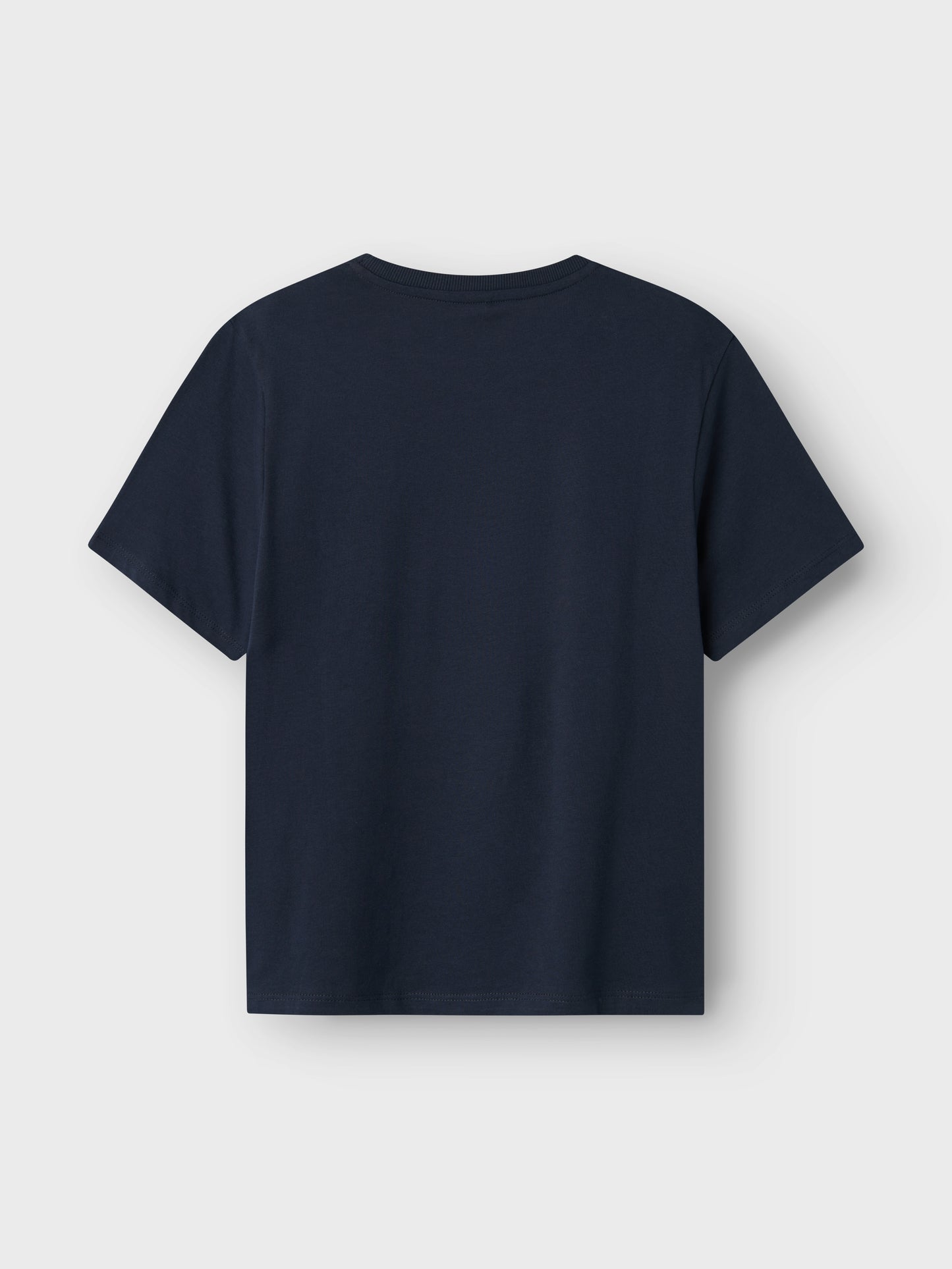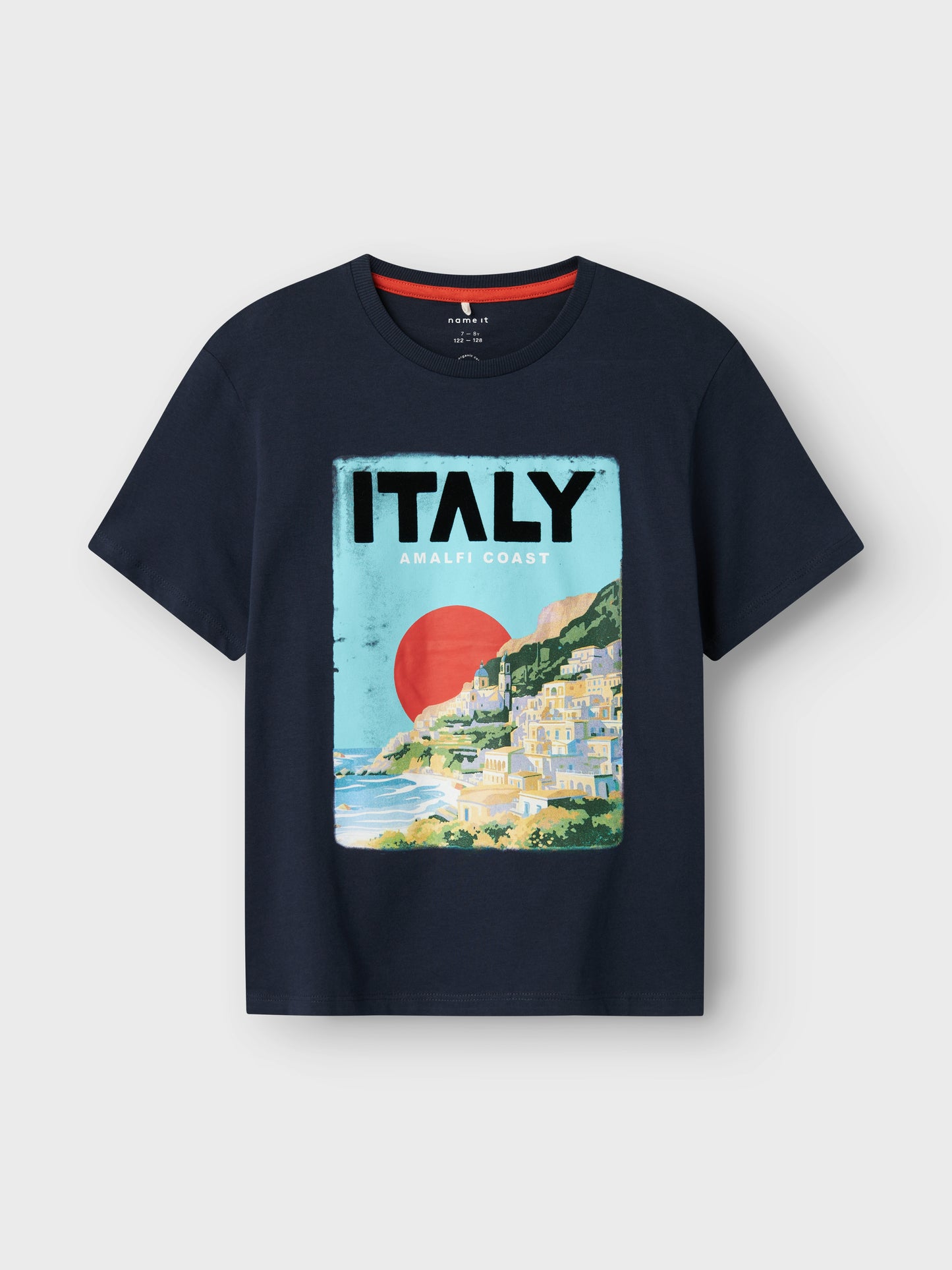 Snygg blå t-shirt i skön ekologisk och återvunnen bomull med målat tryck av Italien.