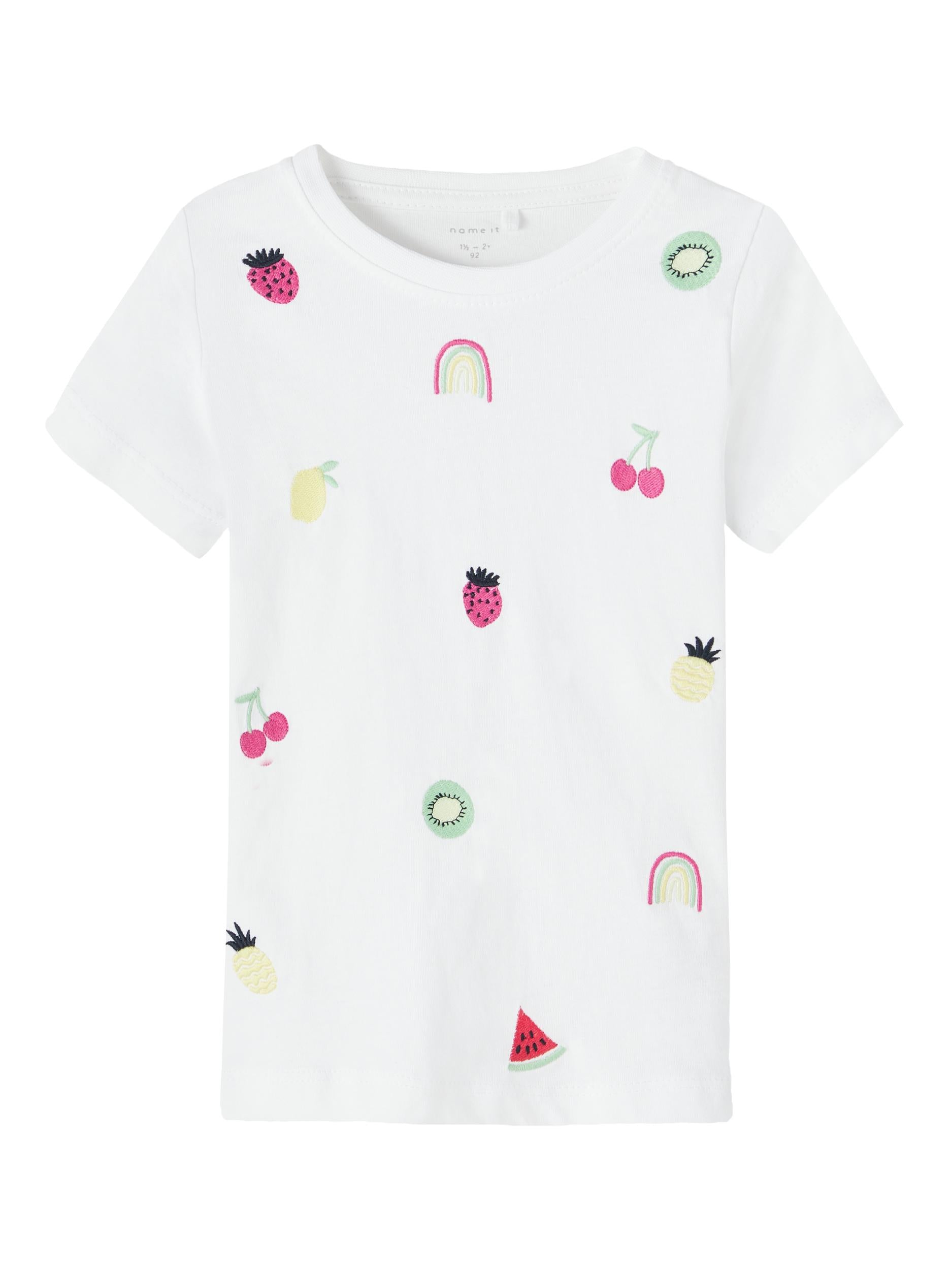 Kortärmad topp med söta broderade frukter och bär, tillverkad i ekologisk bomull
