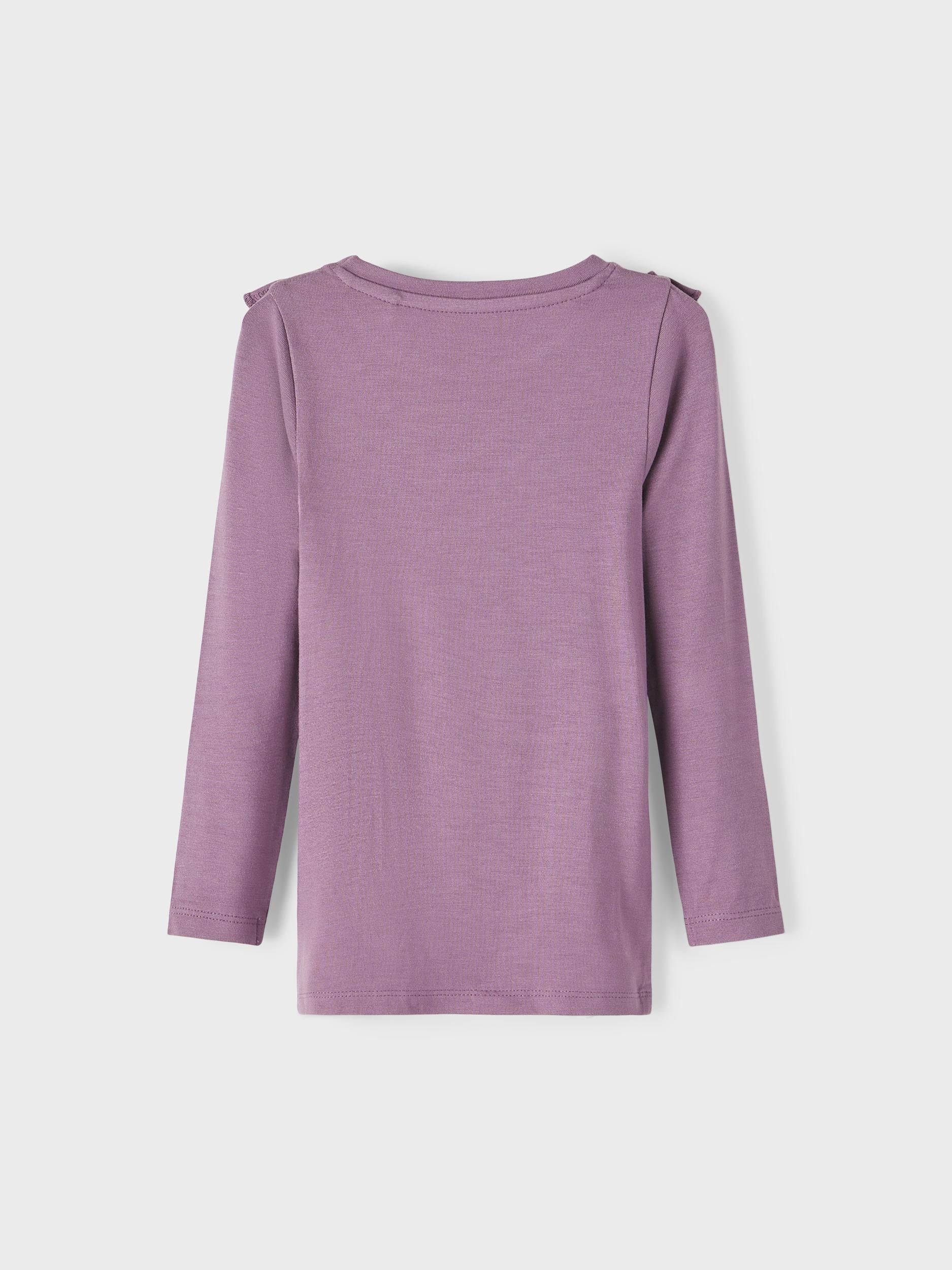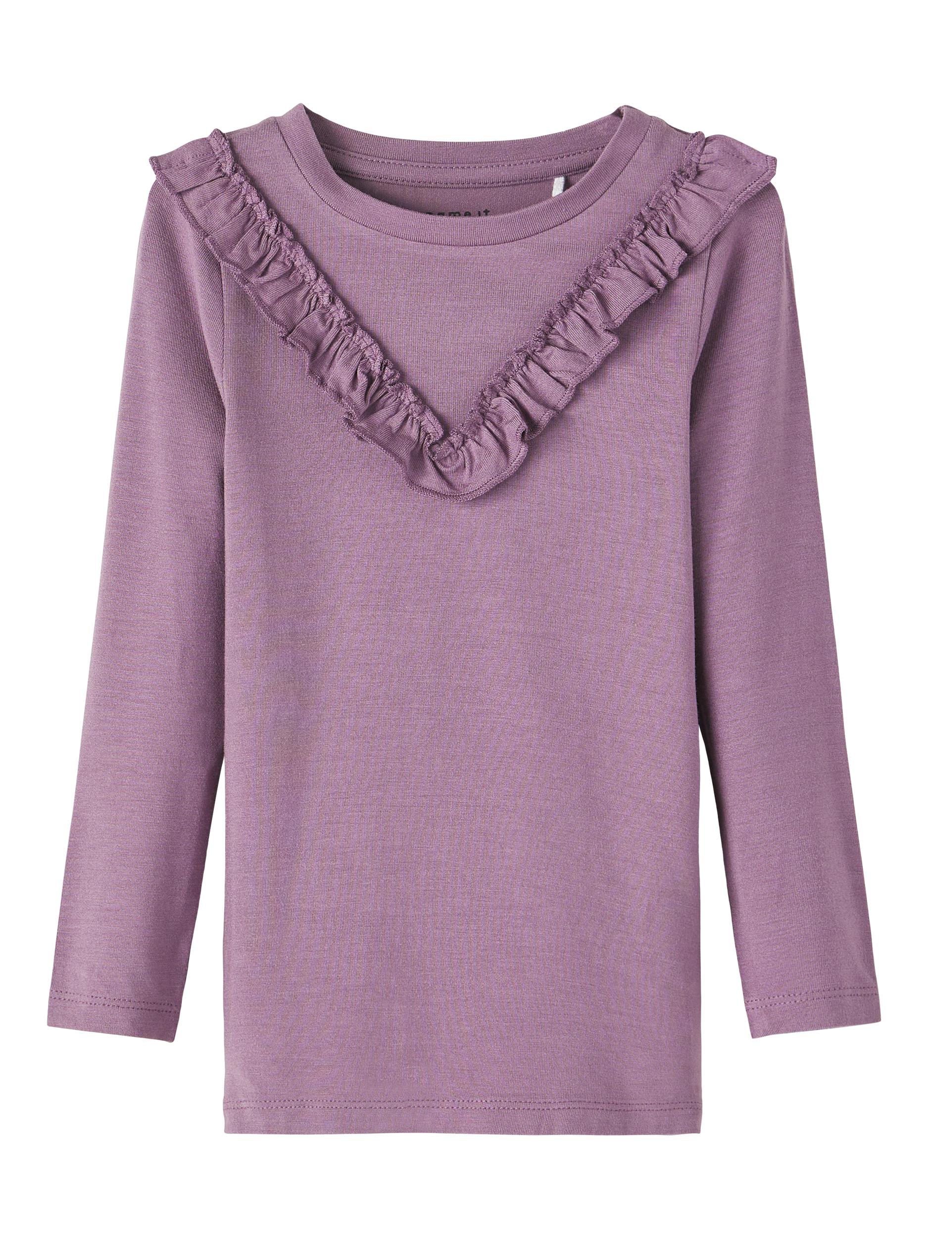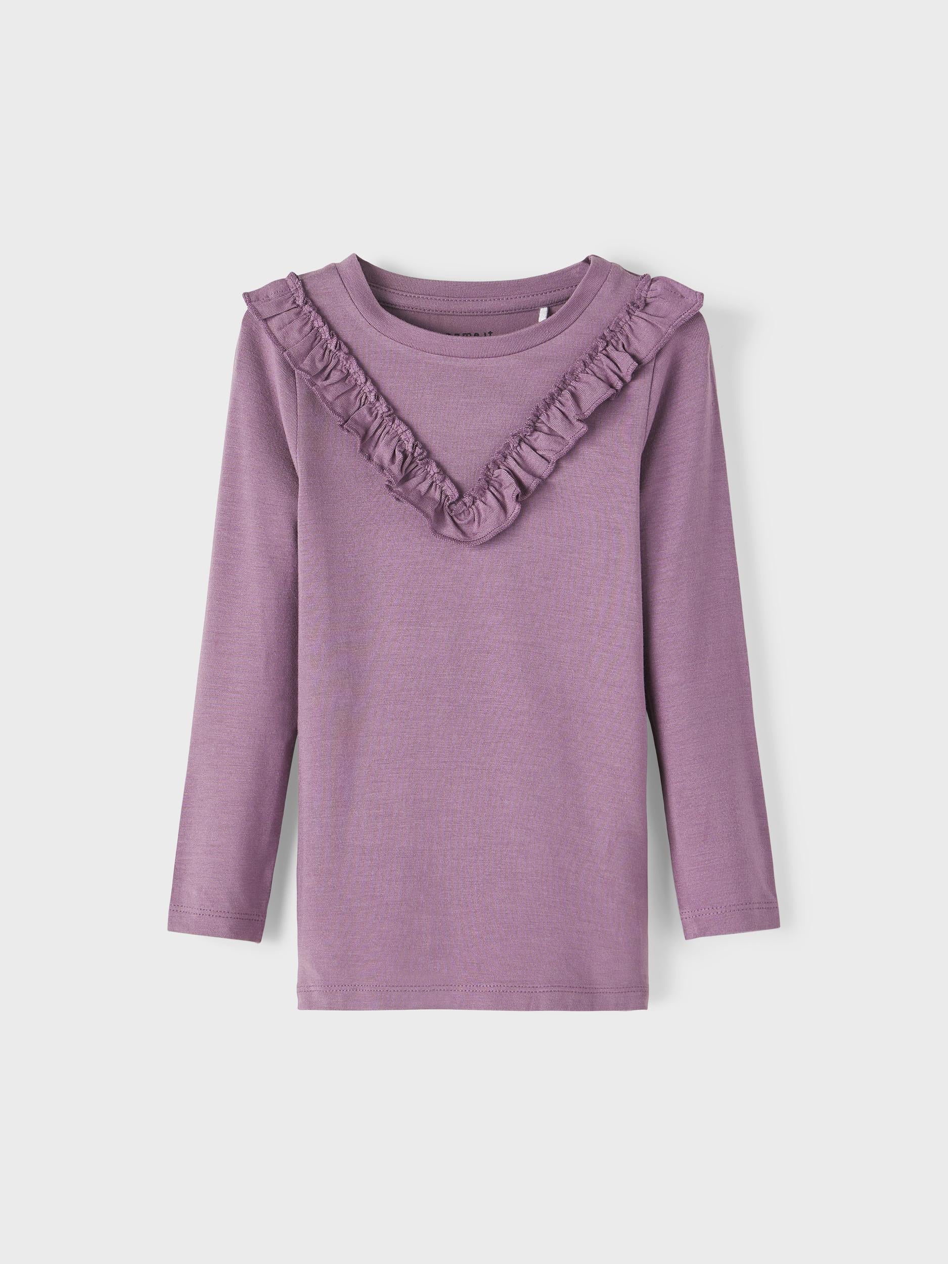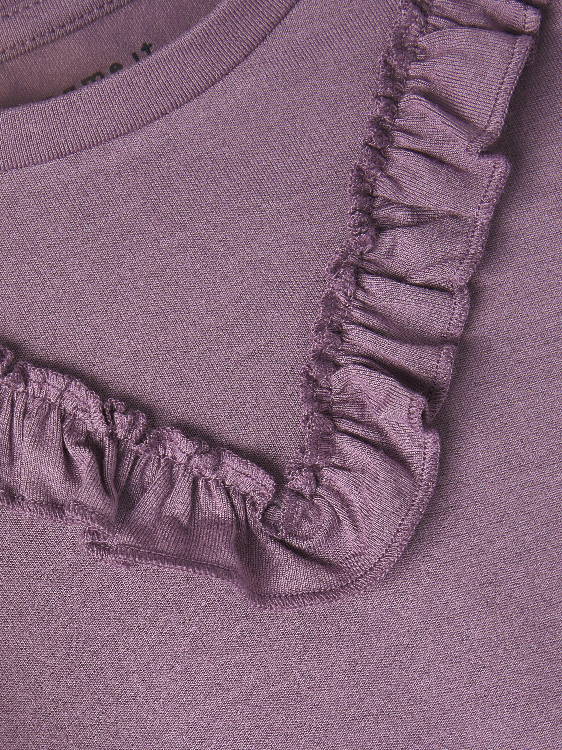 Ge ditt barn en cool topp med fin färg och en vacker volang runt halsen. Toppen funkar vardagligt men går att styla upp till finare tillfällen. Toppen är lätt i tyget och stretchig, detta gör att toppen är även väldigt bekväm.