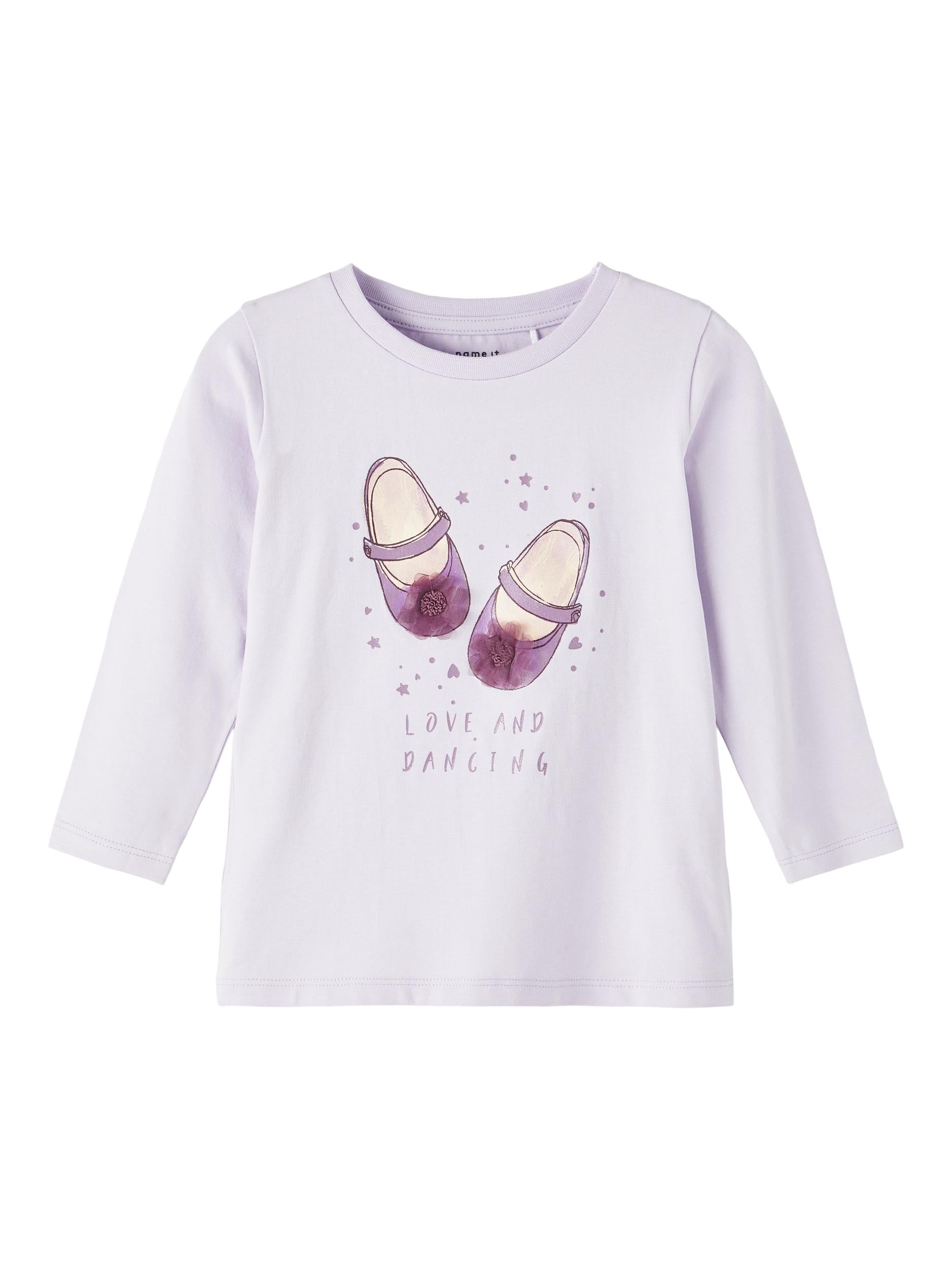 Långärmad t-shirt med sött motiv av små ballerinaskor. Tillverkad i mjuk ekologisk bomull.