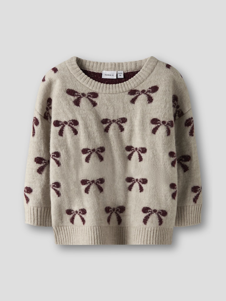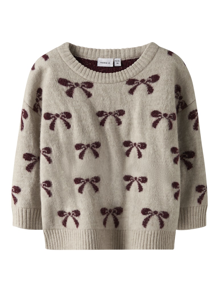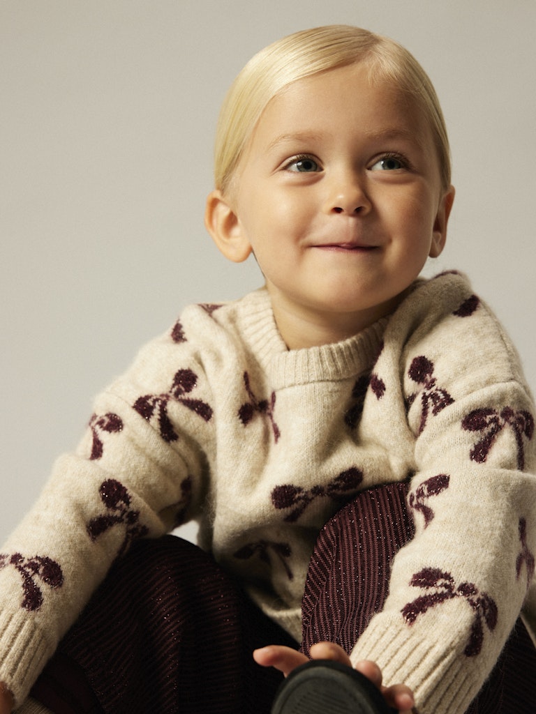 En söt och mjuk stickad tröja från Name It i beige med fint vinrött rosettmönster. Tröjan har rund hals, ribbade kanter och en bekväm passform som gör den perfekt till både vardag och finare tillfällen. En charmig stickad favorit som håller barnet varmt och stiligt under säsongen.