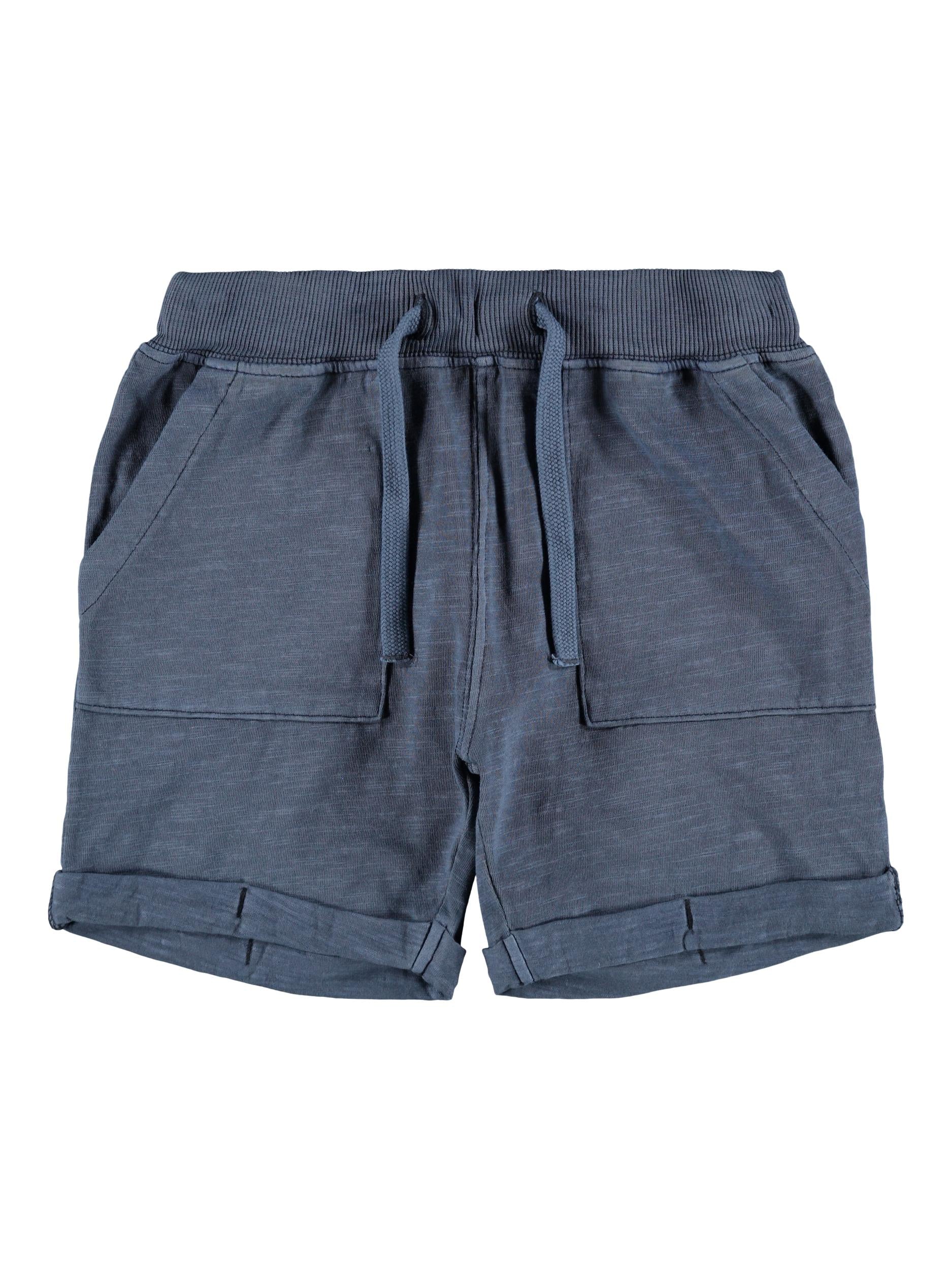 Snygg blå mjukisshorts i ekologisk bomull. Ställbar midja och tuff modell med stora fickor.