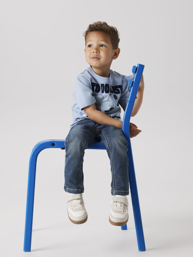 Denna kortärmade topp är tillverkad i mjuk, stretchig jersey som är lika skön att bära som den är rolig att titta på. Med ett färgstarkt tryck av älskade Stitch – den charmiga lilla busen från Disney – får plagget både attityd och värme. Det fluffiga flocktrycket och mjuka gummitrycket skapar en spännande struktur som barn älskar att känna på. Perfekt både till vardags och när något lite extra behövs!
