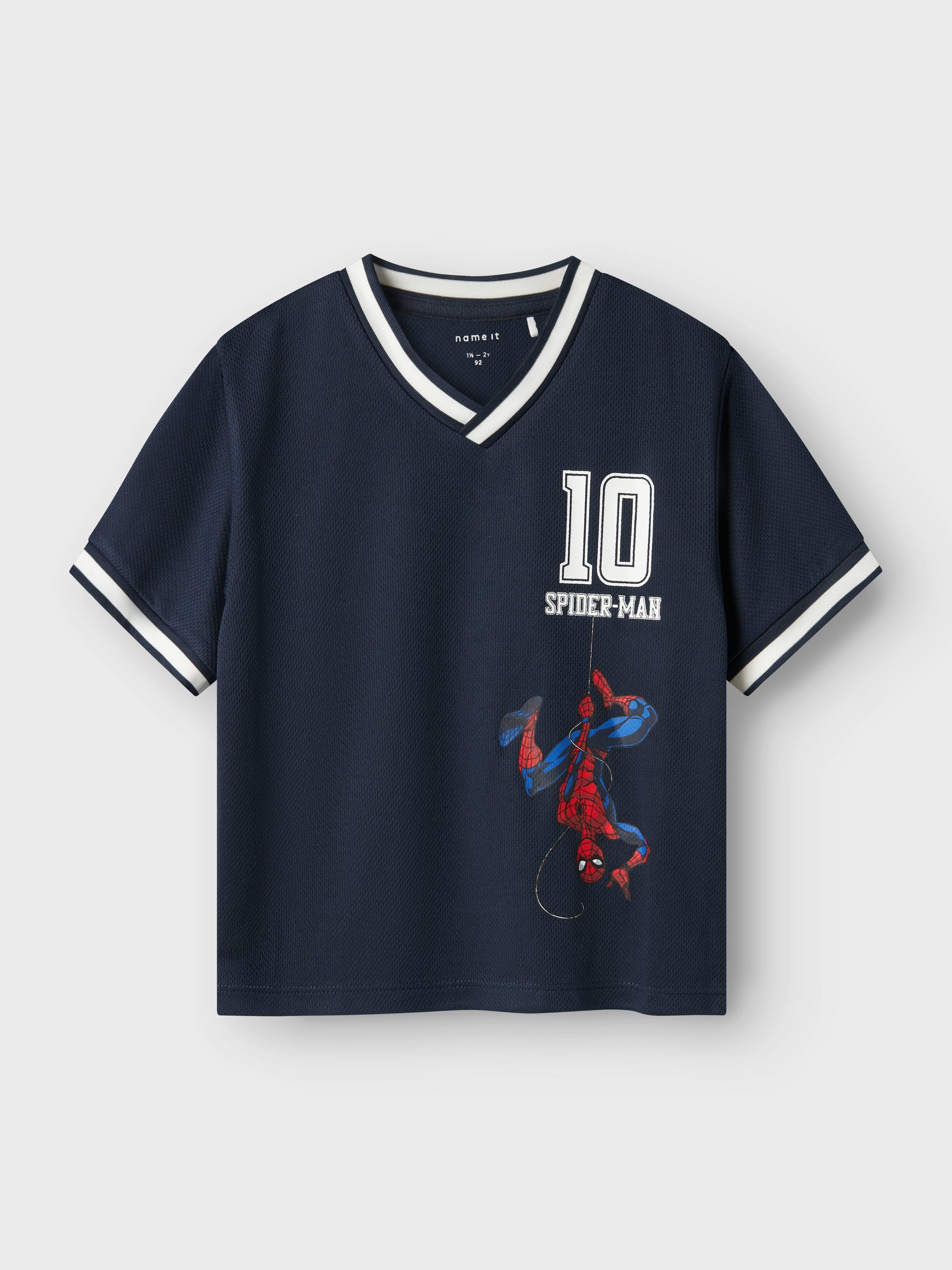 Kortärmad t-shirt v-ringad nummer 10 med spiderman. Snyggt med en liten annorlunda t-shirt i polyester så den känns som en sport-tröja, fotbollströja i materialet.