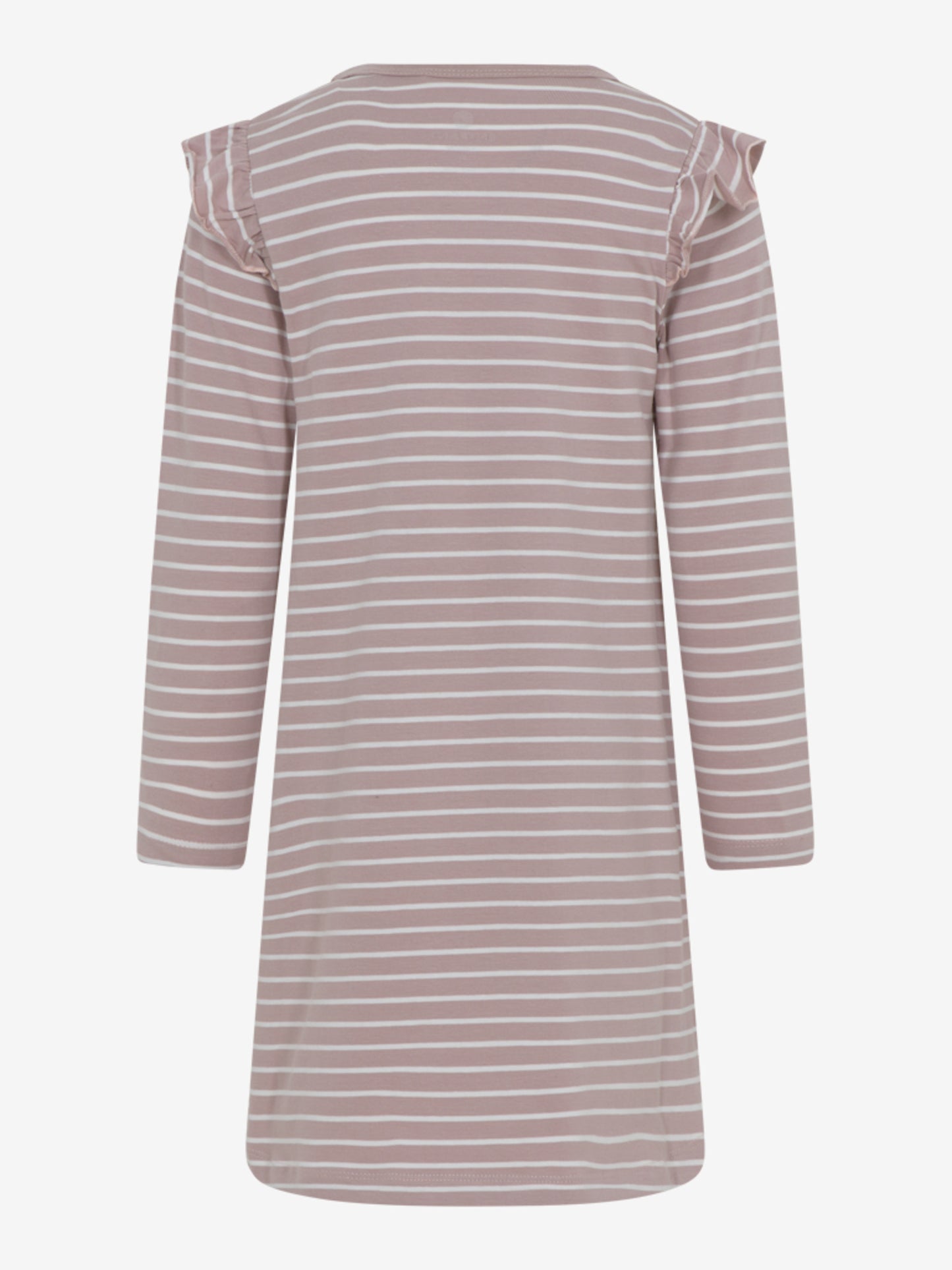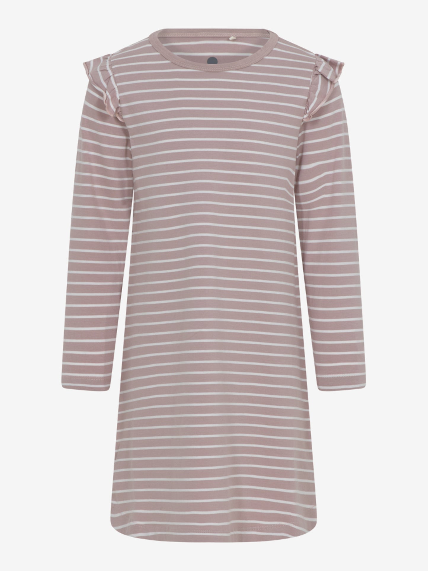 Nattlinne från En Fant med långa ärmar. Nattlinnen har ränder och är gjord av töjbar singeljersey från ekologisk bomull. Nattlinnen har fina volanger på axlarna.