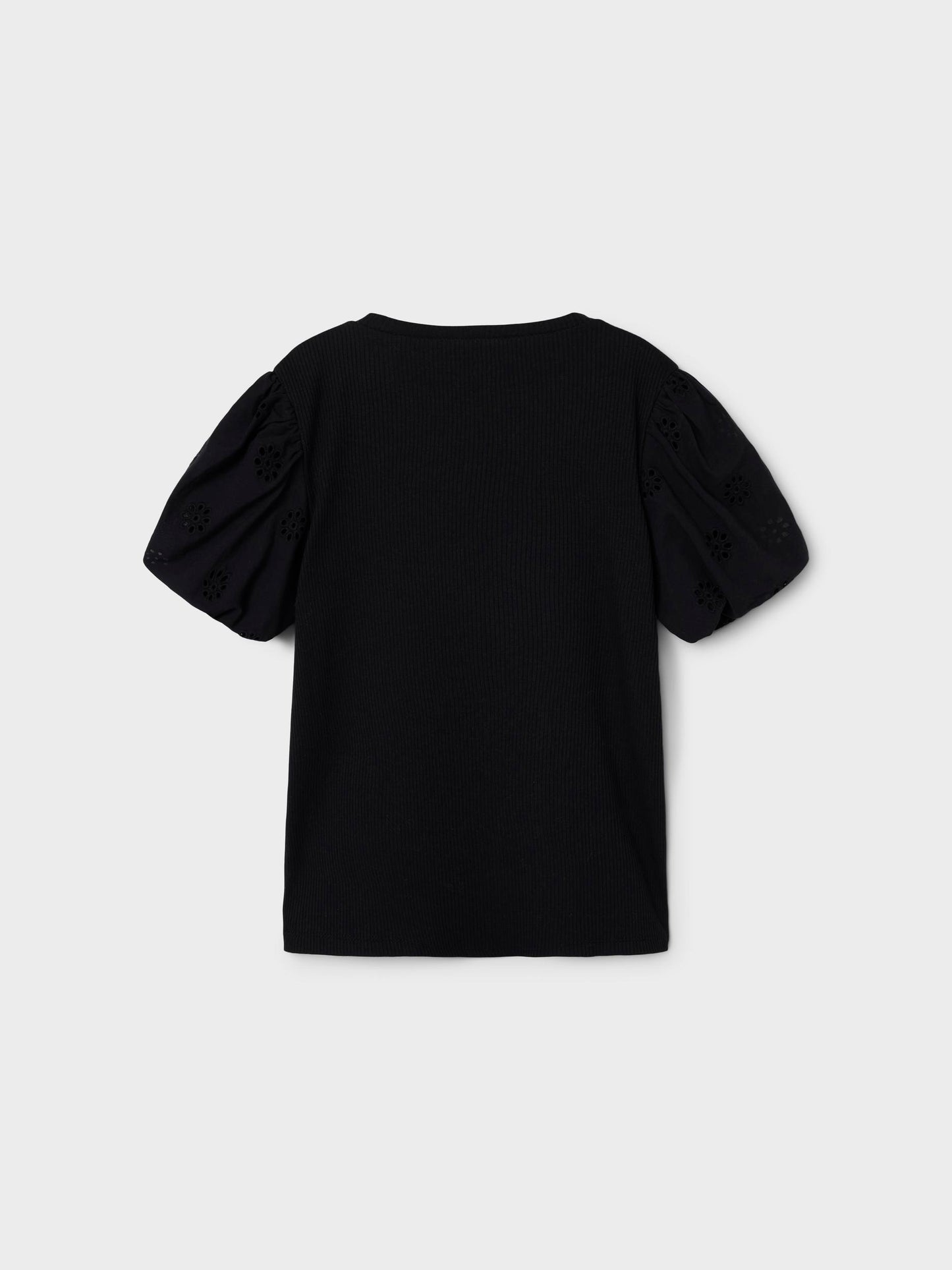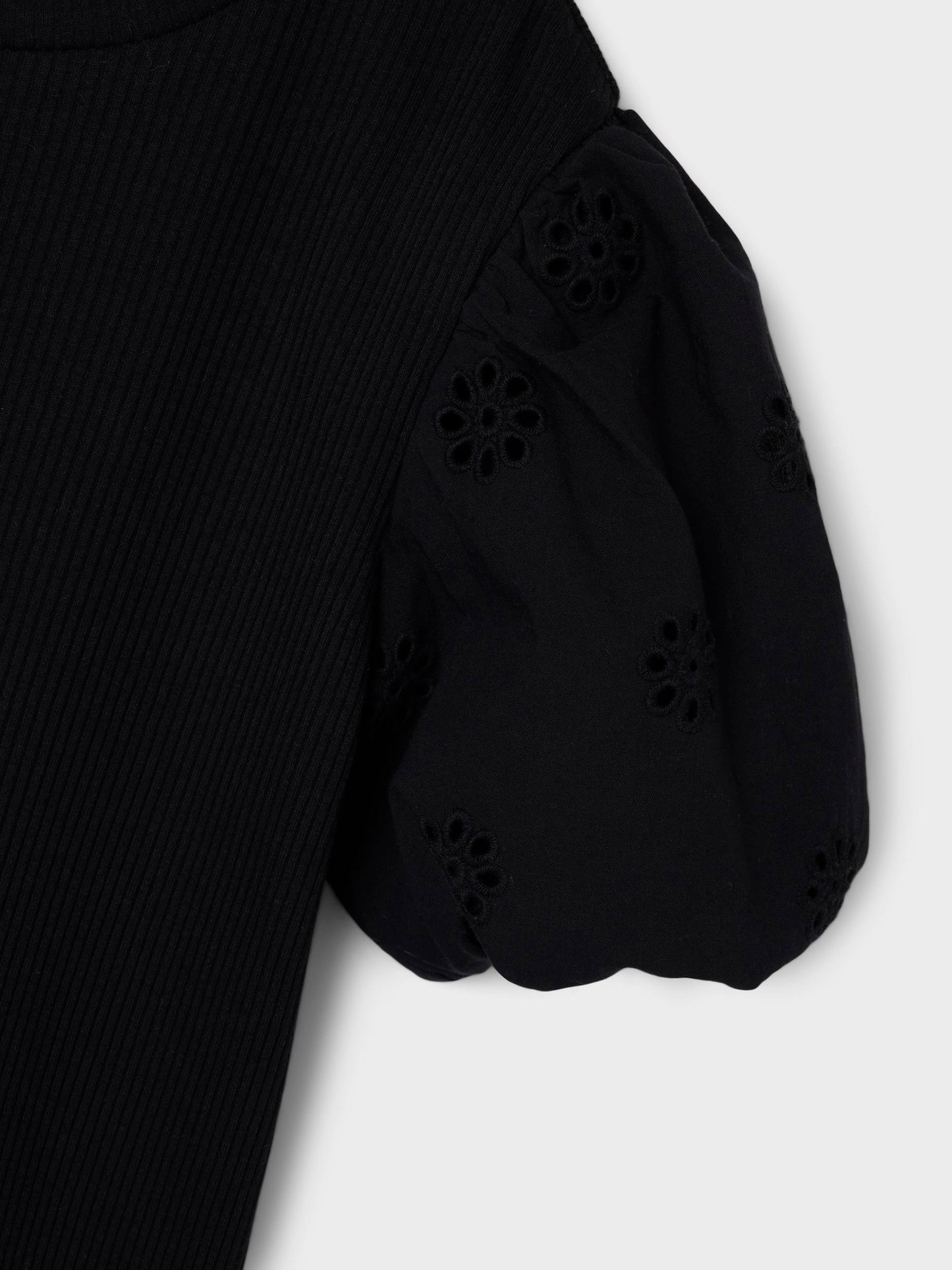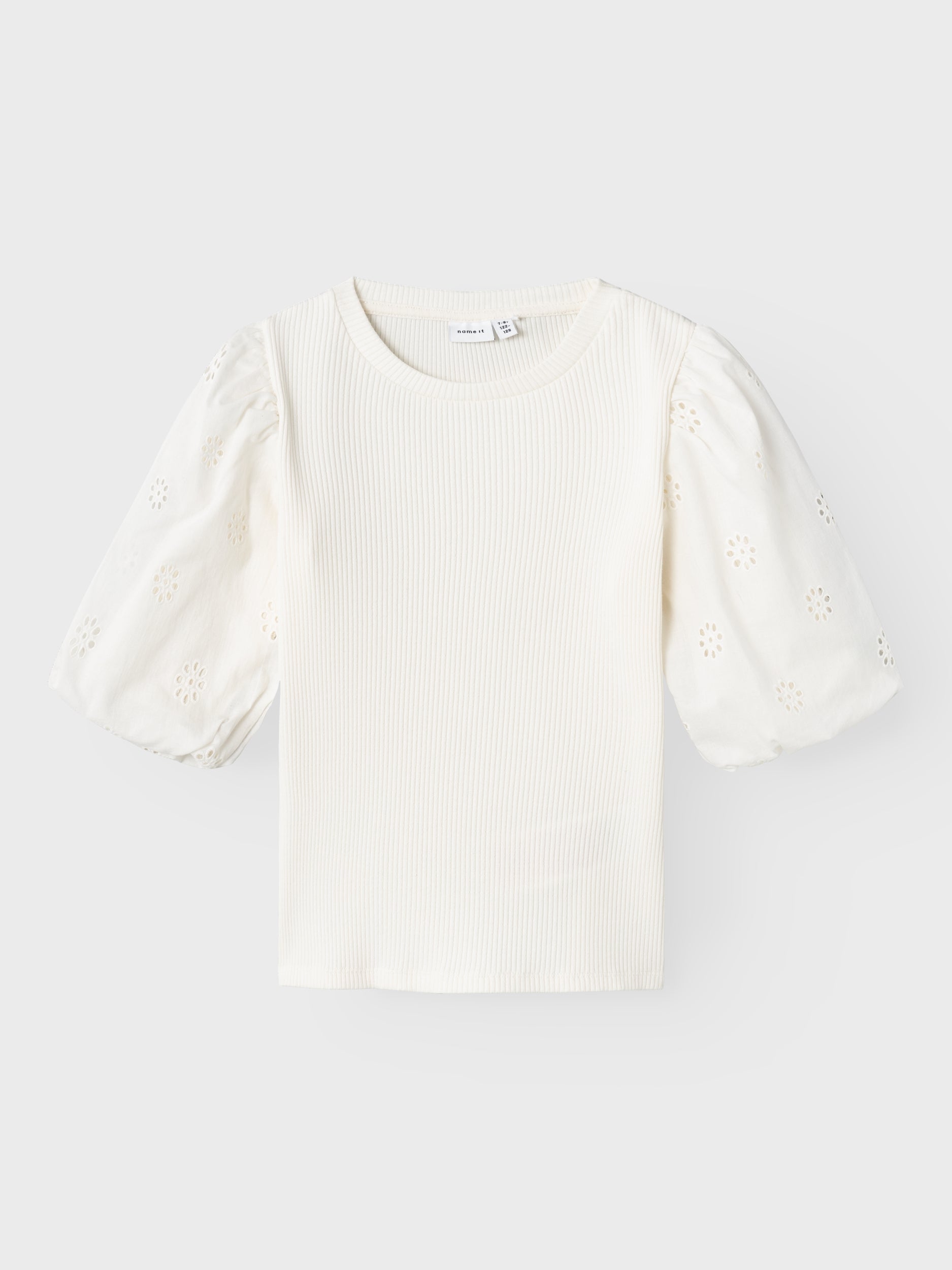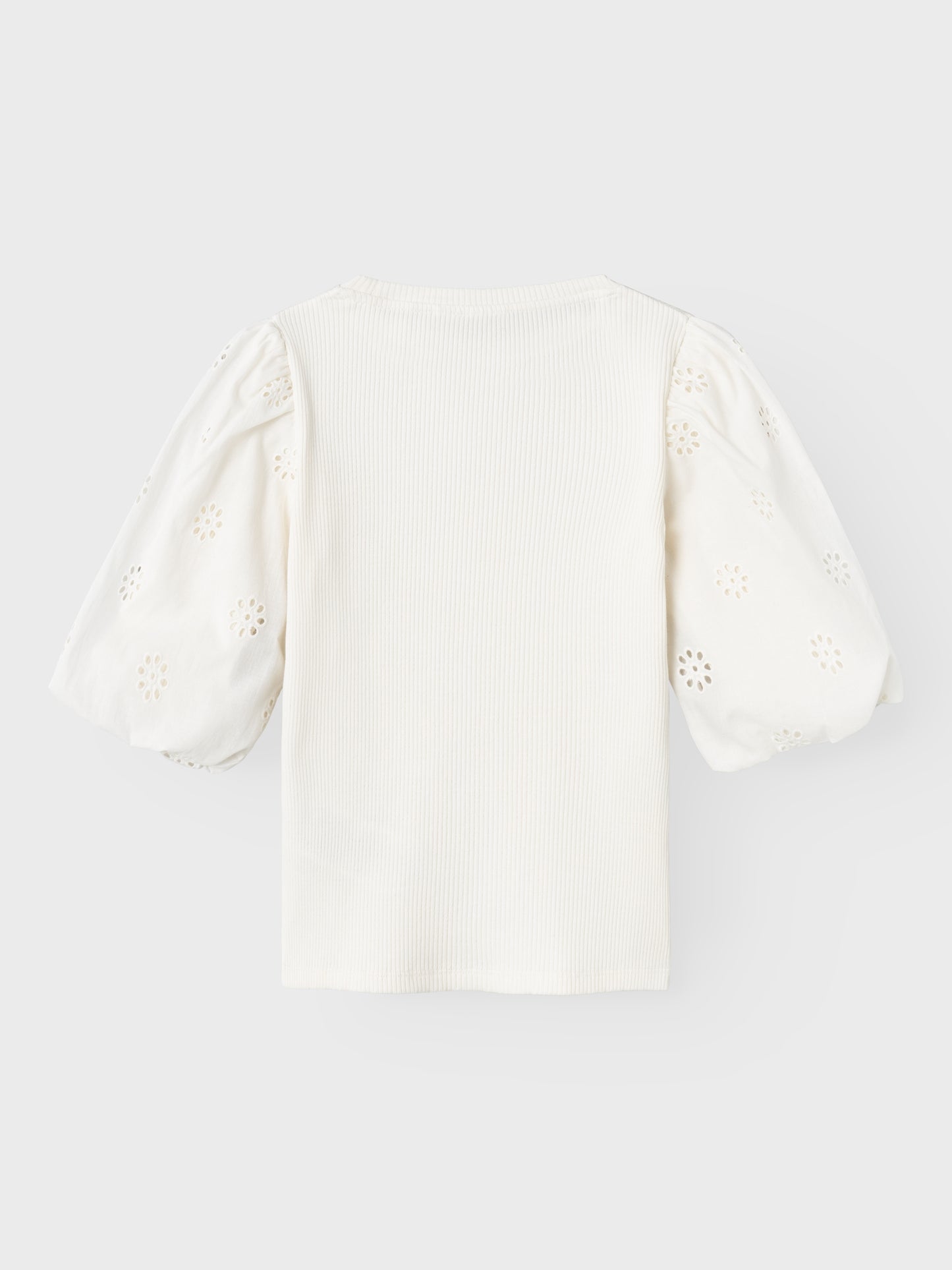 Söt kortärmad tröja som passar både vardag och fest. Ribbad kvaliet, men ärmar i en vävd spetskvalitet. Vi älskar denna tröja helt enkelt. Ribbstickad har ett vertikalt, randigt mönster och bra elasticitet för en skön känsla och en tidlös look.