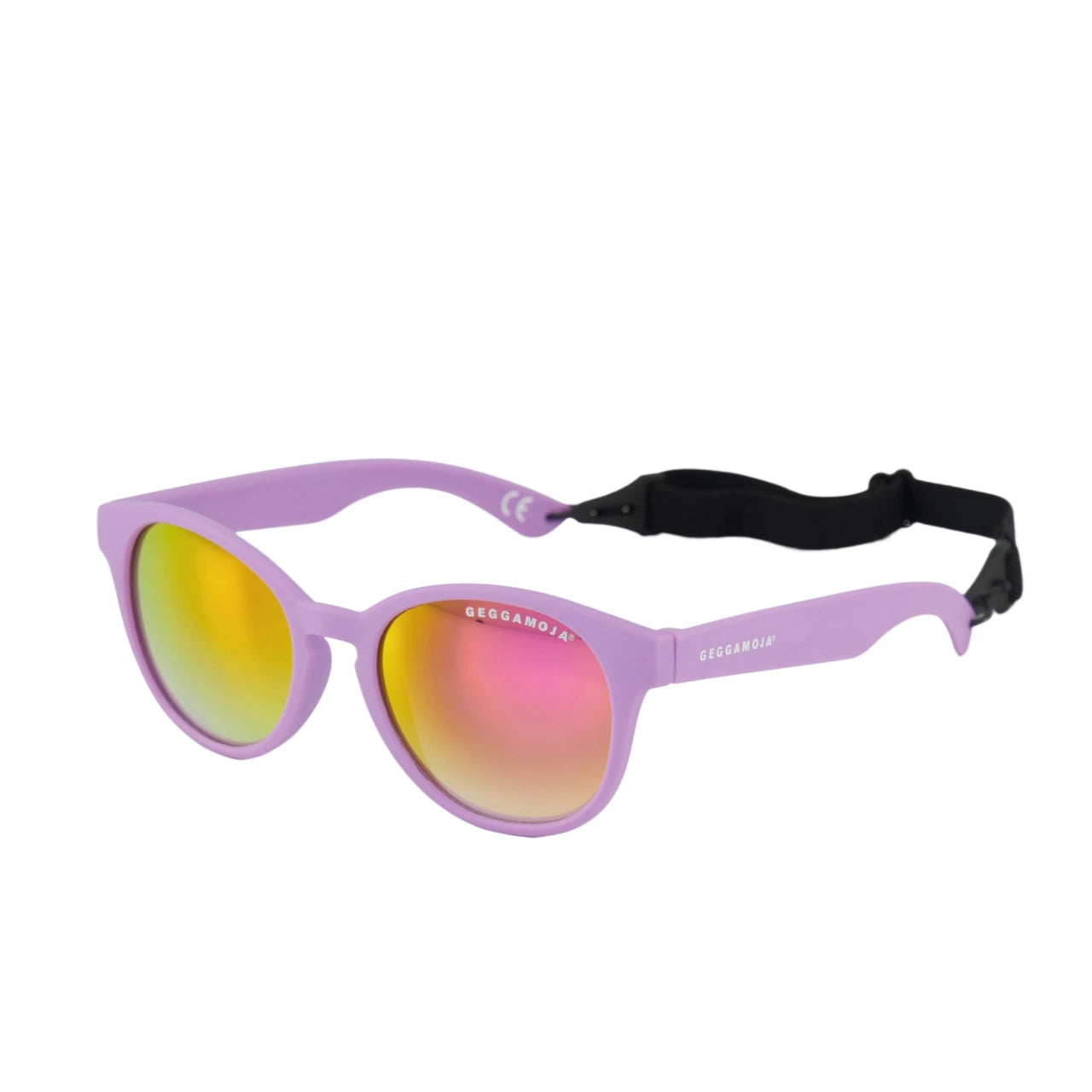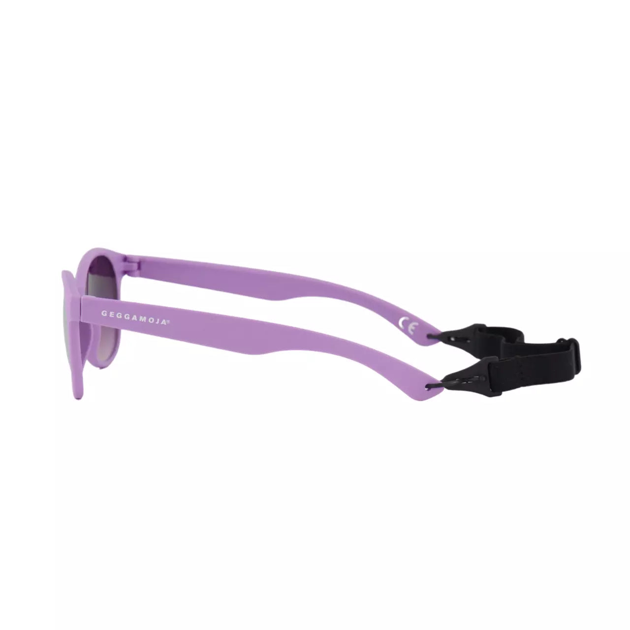 Coola lila solglasögon till ditt barn. Mjuka och följsamma i silikon för att klara barnens oförsiktiga behandling. Snodd i resår att sätta runt huvudet för att de ska sitta på plats. Snodden är avtagbar genom spännen längst ut på skalmarna samt reglerbar för perfekt passform.
