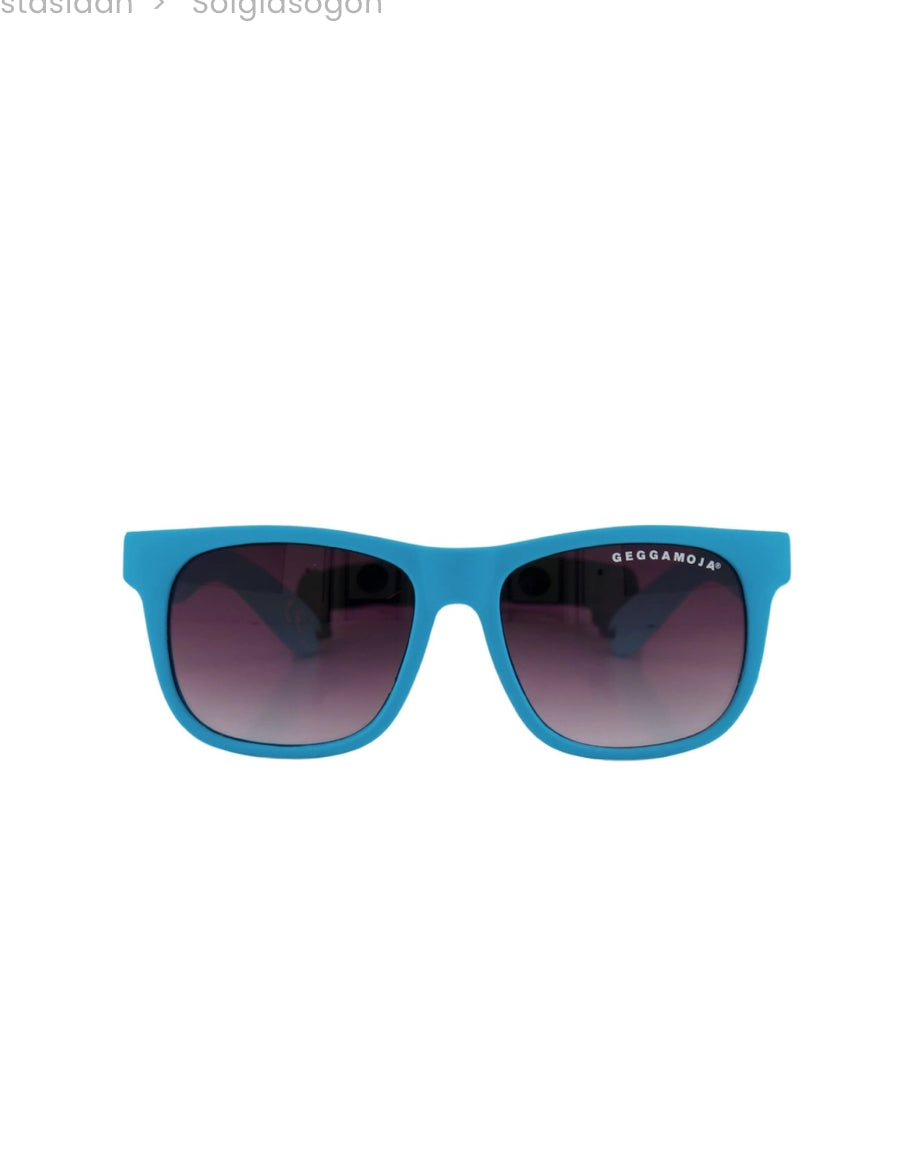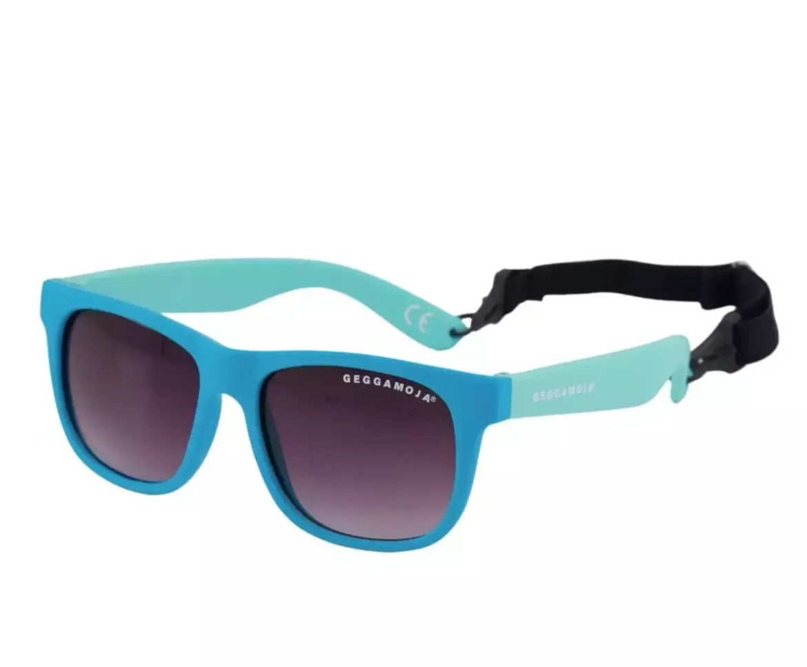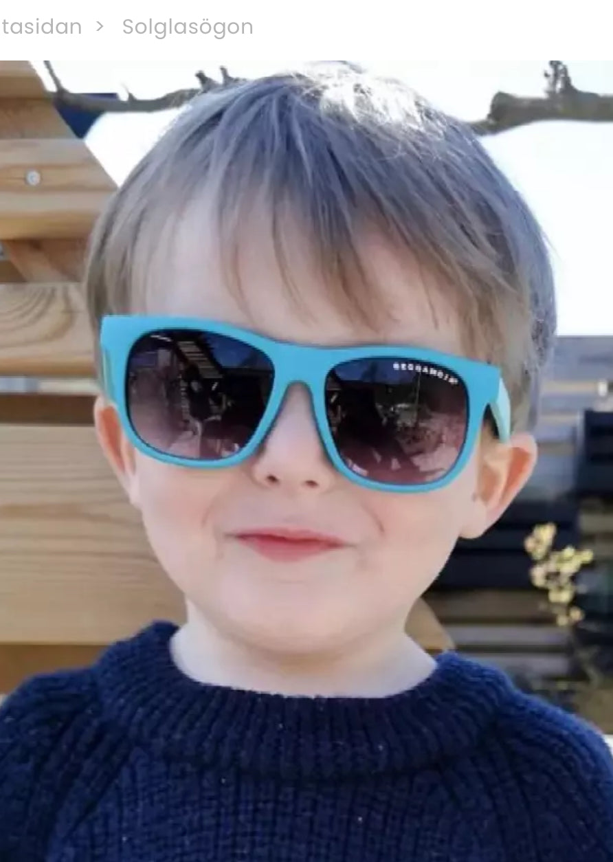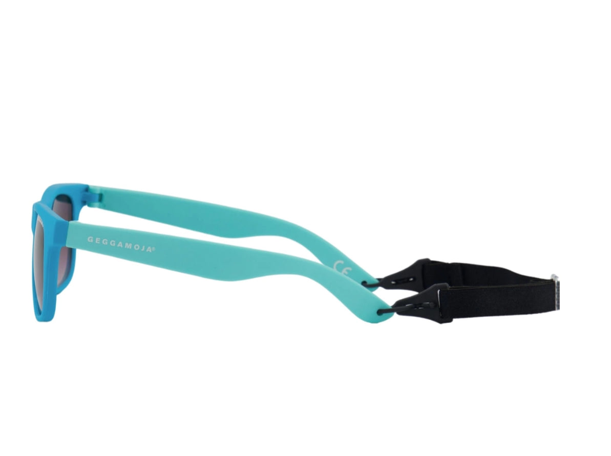 Coola blå solglasögon med turkosa skalmar för ditt barn. Mjuka och följsamma i silikon för att klara barnens oförsiktiga behandling. Snodd i resår att sätta runt huvudet för att de ska sitta på plats. Snodden är avtagbar genom spännen längst ut på skalmarna samt reglerbar för perfekt passform.