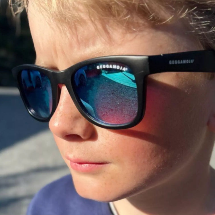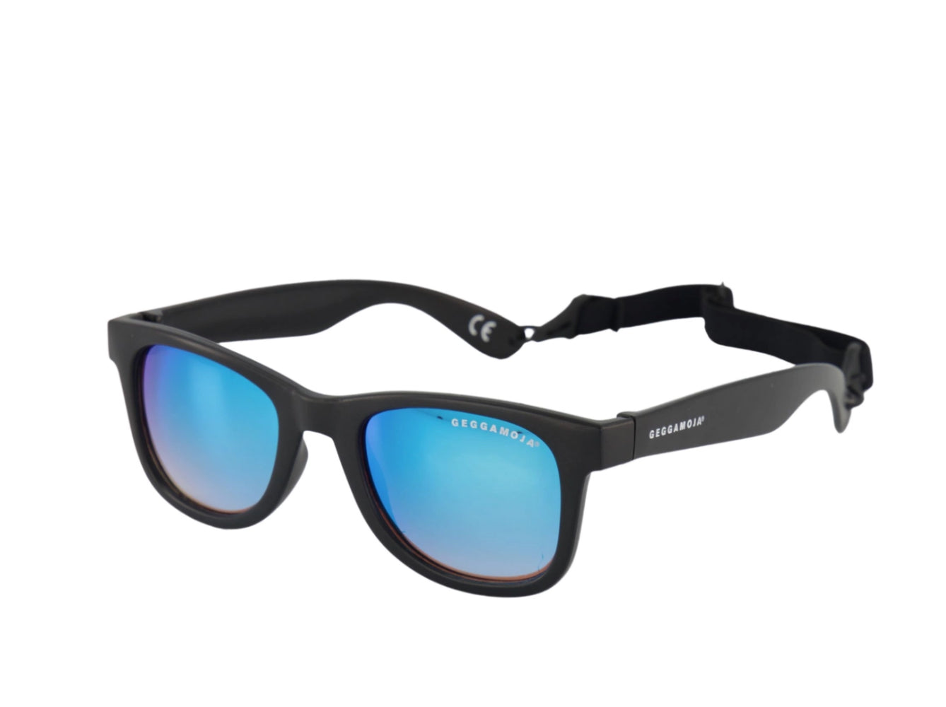Coola svarta solglasögon till ditt barn. Mjuka och följsamma i silikon för att klara barnens oförsiktiga behandling. Snodd i resår att sätta runt huvudet för att de ska sitta på plats. Snodden är avtagbar genom spännen längst ut på skalmarna samt reglerbar för perfekt passform.