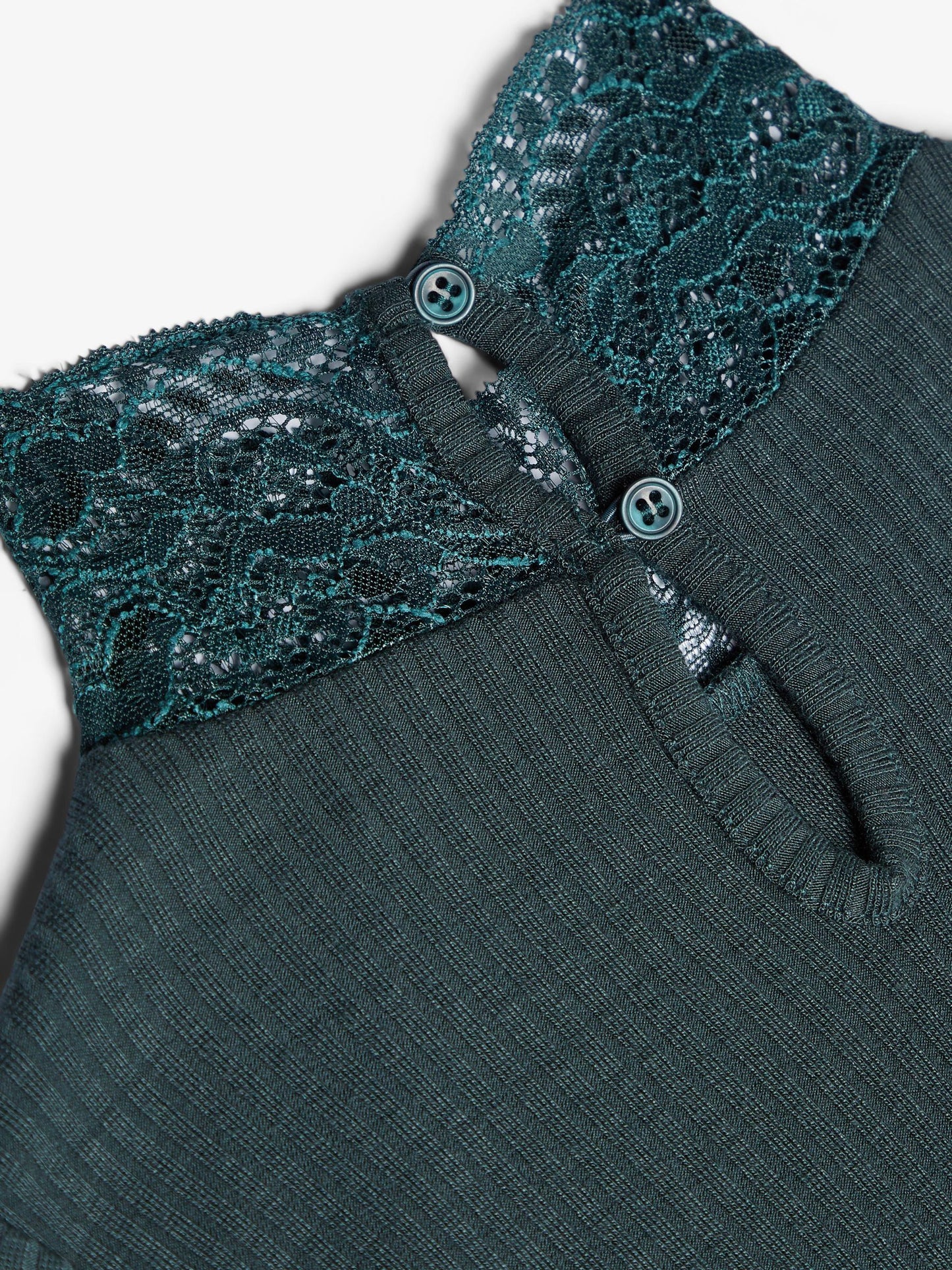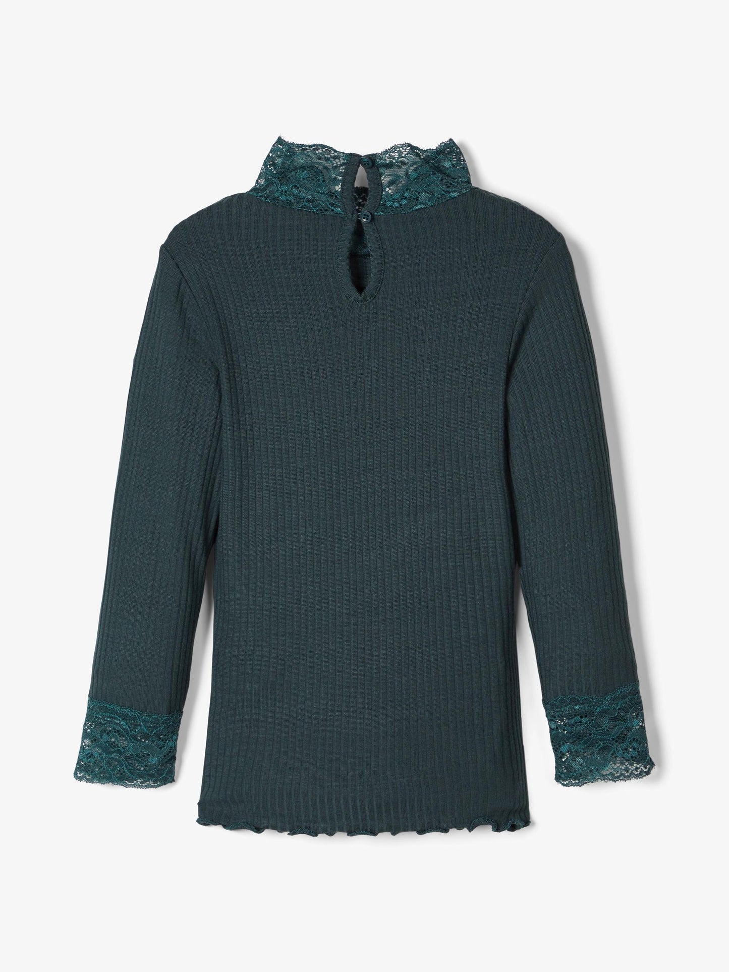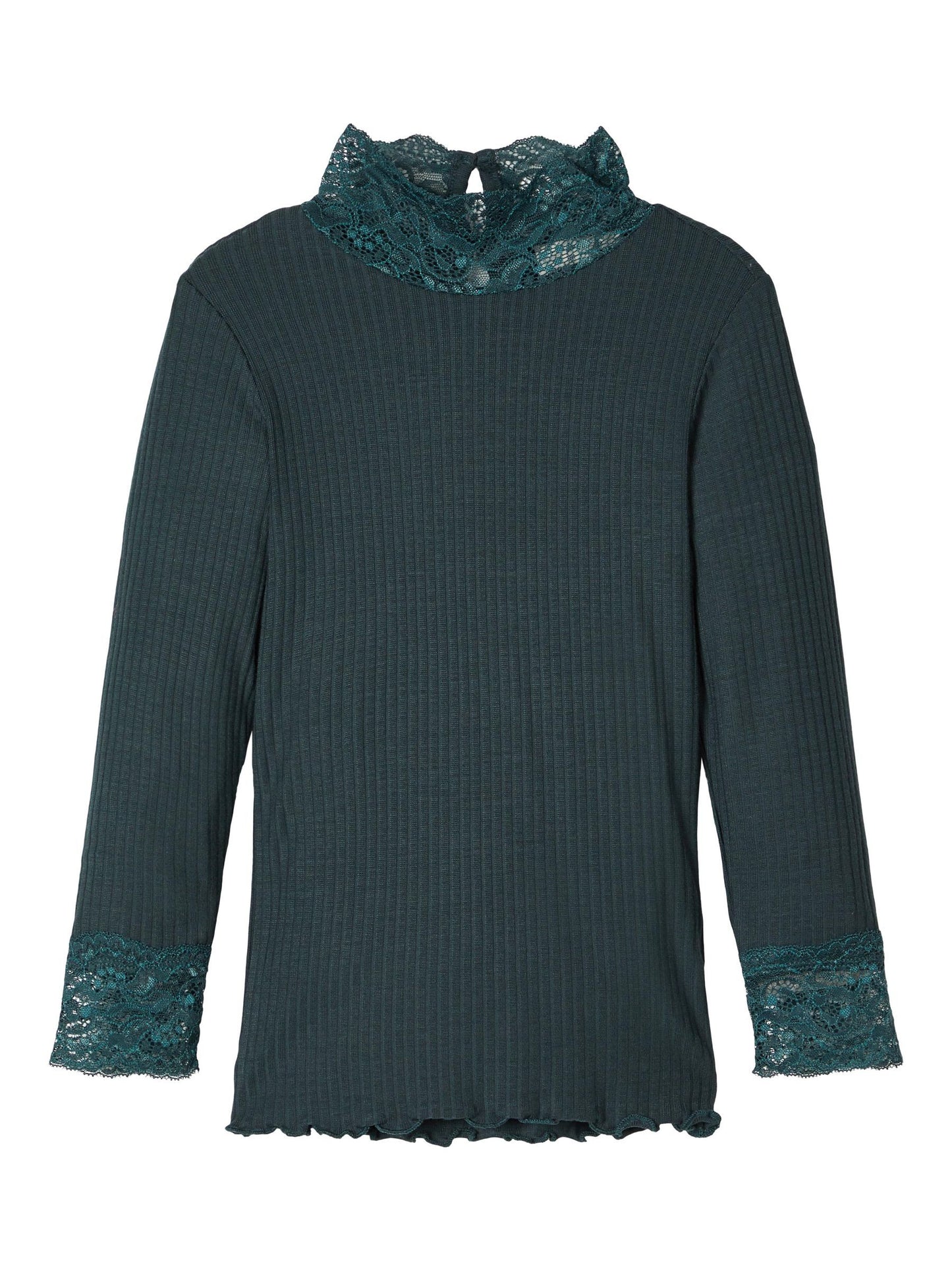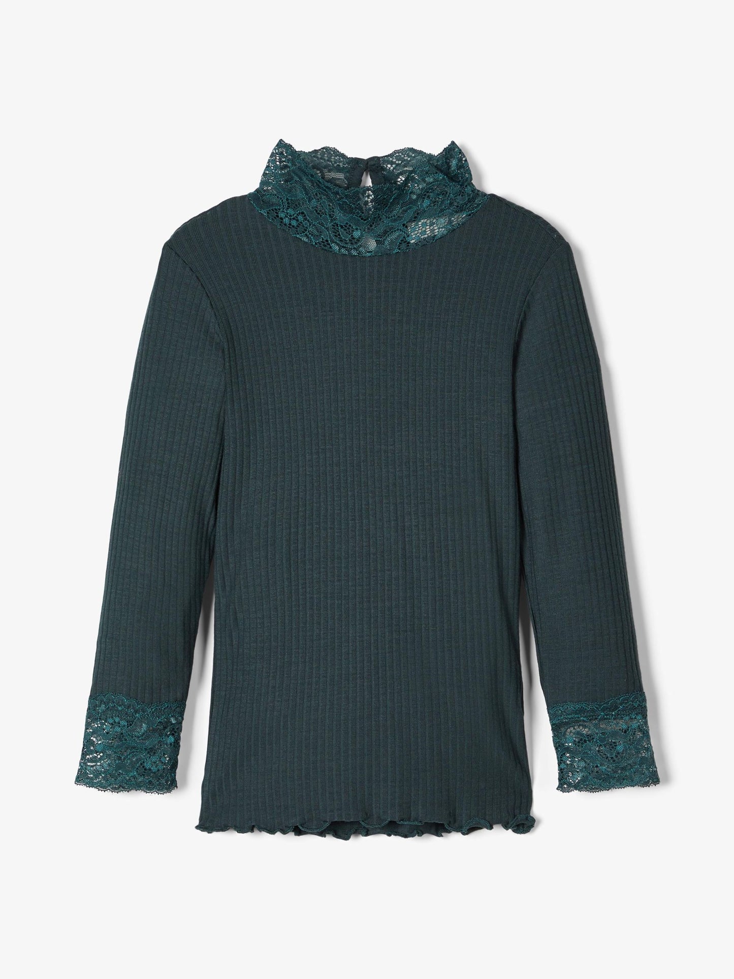 Söt ribbad tröja med spetskrage och spetsmudd vid ärmslut. Väldigt mjuk och skön kvalitet.